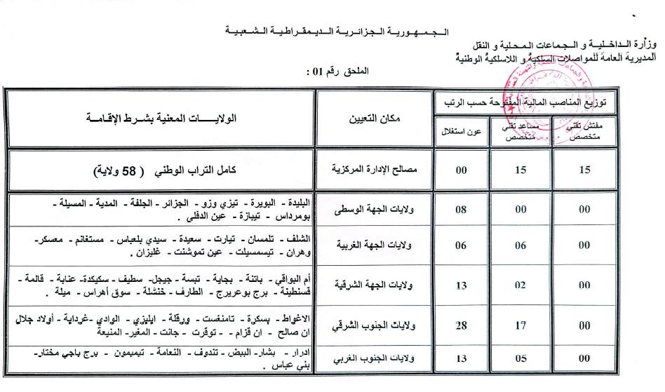 وأوضحت المديرية، أن المسابقة التي ستتم على أساس الشهادة تشمل توظيف 15 مفتشًا تقنيًا متخصصًا و45 مساعدًا تقنيًا متخصصًا، إلى جانب 68 عون استغلال.