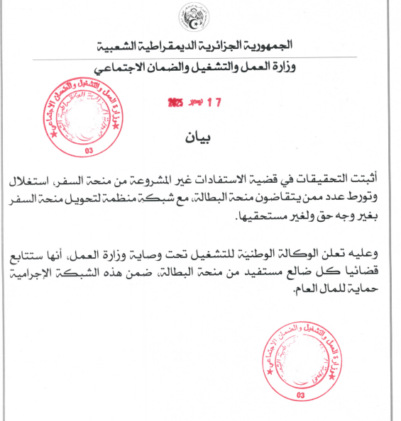 كشفت وزارة العمل والتشغيل والضمان الاجتماعي، اليوم الاربعاء، عن تورّط عدد ممن يتقاضون منحة البطالة مع شبكة منظّمة لتحويل منحة السّفر بغير وجه حقّ ولغير مستحقّيها.