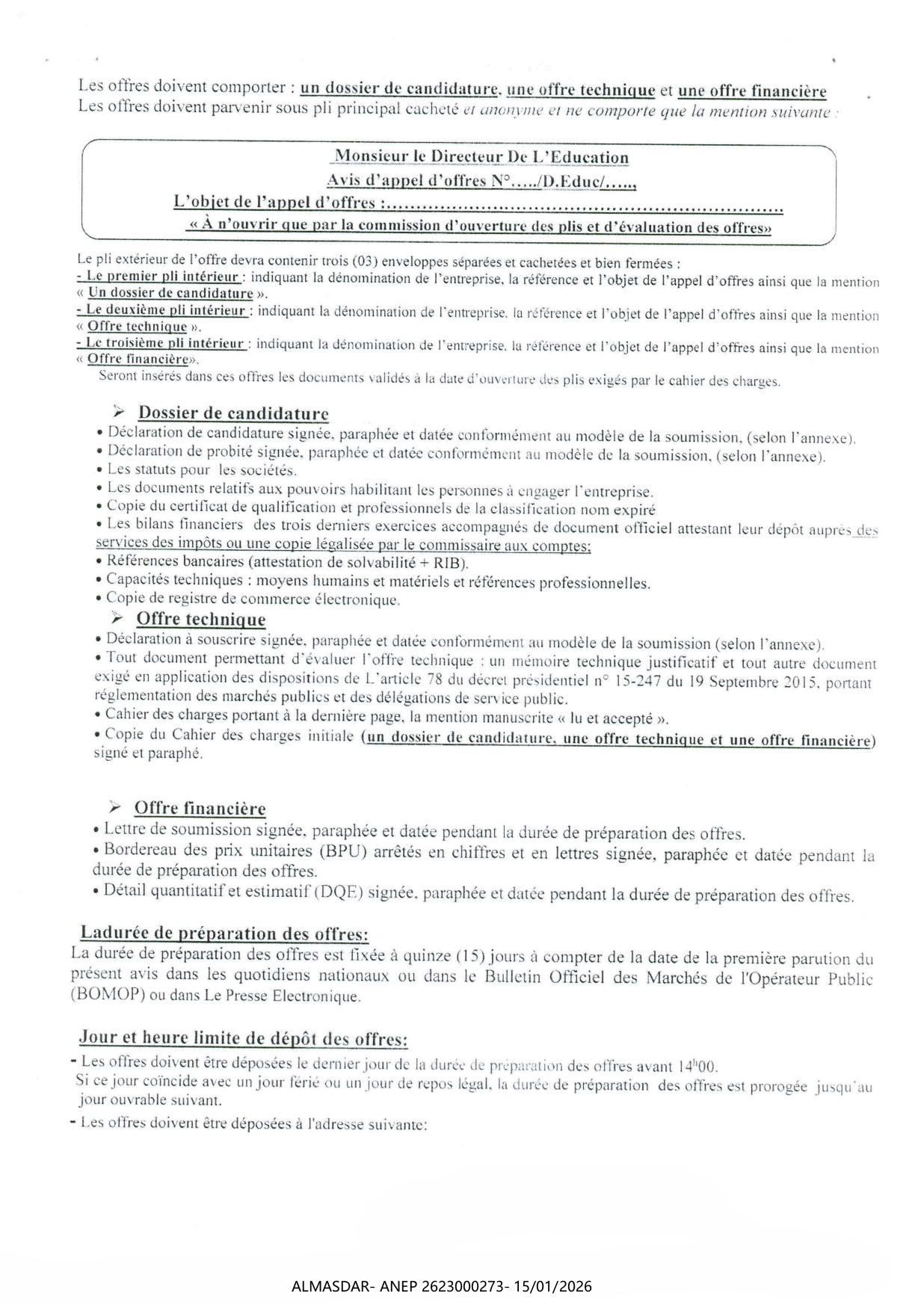 الزبون: DIRECTION DE L'EDUCATION WILAYA DE TEBESSA رقم ANEP 2623000273 تاريخ النشر: 2026-01-15 عدد الصفحات: 3/4