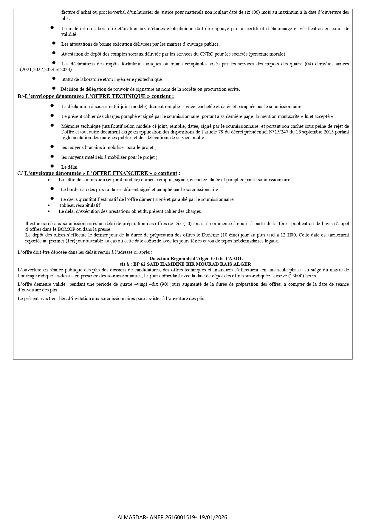 الزبون: -AADL - DIRECTION REGIONALE D’ALGER EST رقم ANEP 2616001519 تاريخ النشر: 2026-01-19 عدد الصفحات: 1/2