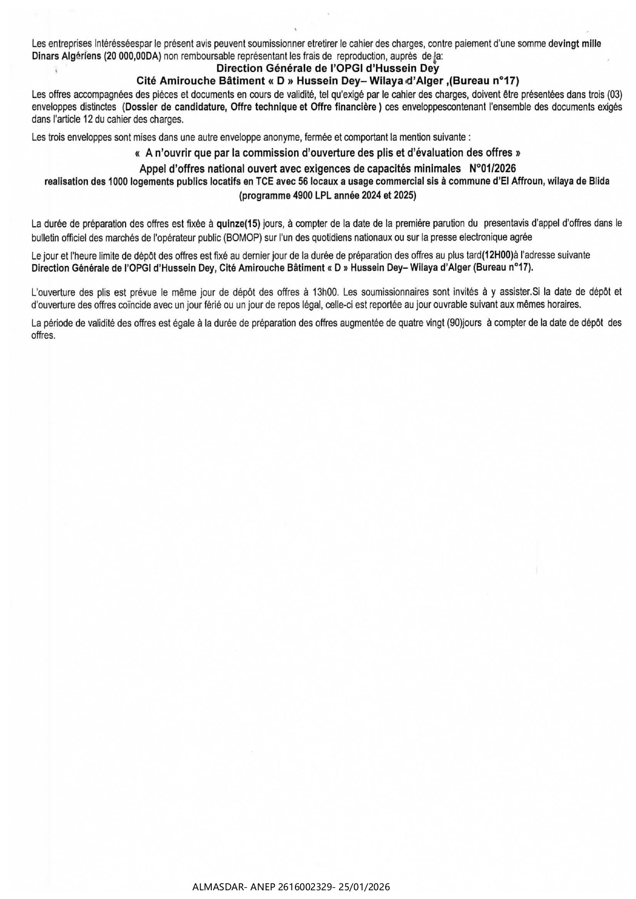 الزبون: OFFICE DE PROMOTION ET DE GESTION IMMOBILIERE D'HU_SEIN -DEY رقم ANEP 2616002329 تاريخ النشر: 2026-01-25 عدد الصفحات: 1/2
