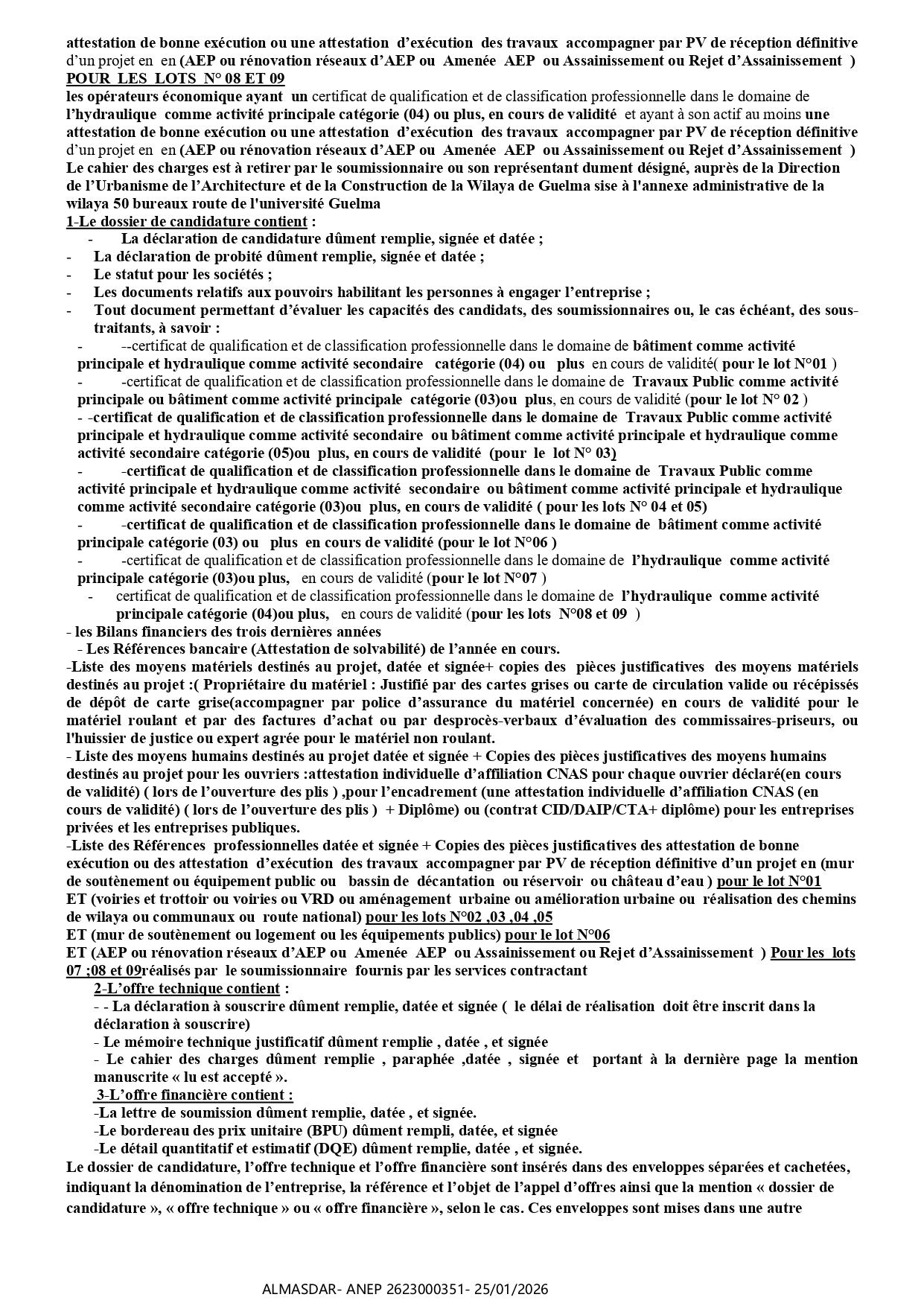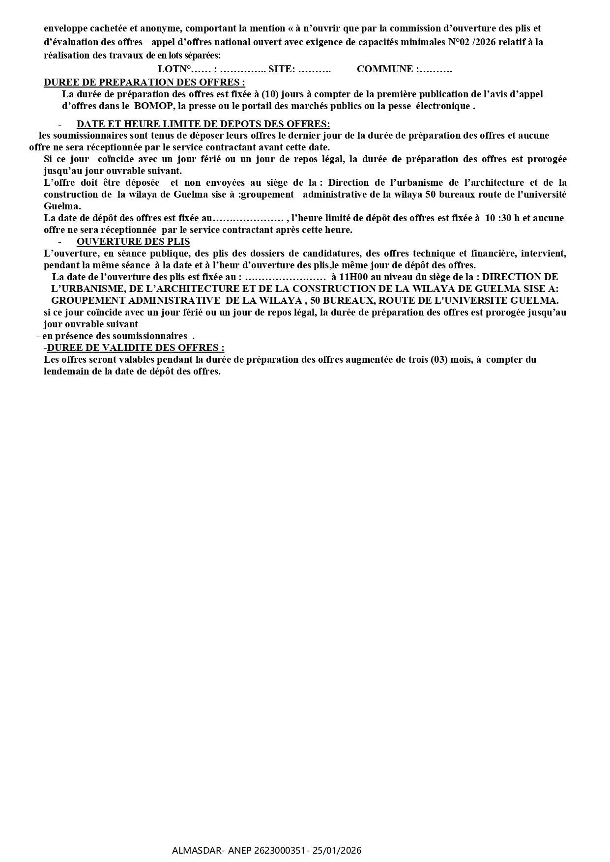 الزبون: DIRECTION DE L’URBANISME, DE L’ARCHITECTURE ET DE LA CONSTRUCTION DE LA WILAYA DE GUELMA رقم ANEP 2623000351 تاريخ النشر: 2026-01-25 عدد الصفحات: 3/4