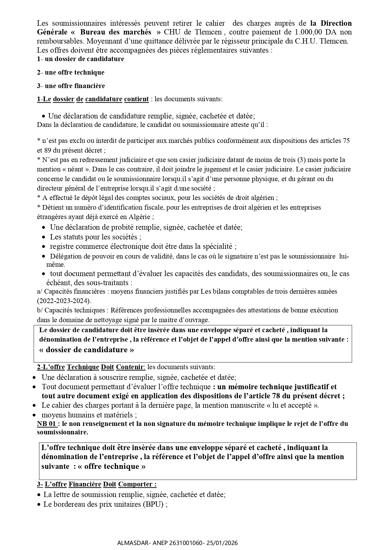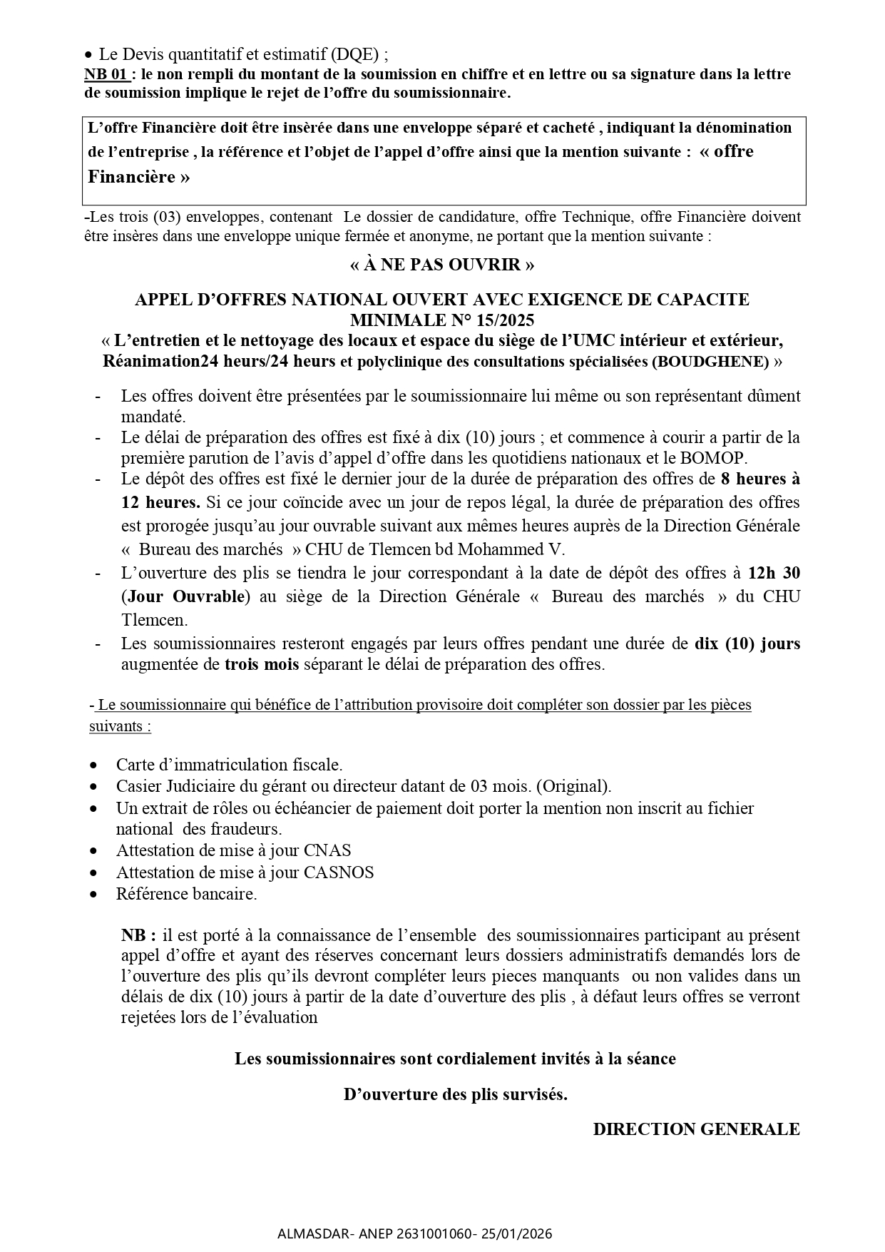 الزبون: Centre Hospitalo-Universitaire Dr Tidjani Damerdji –Tlemcen رقم ANEP 2631001060 تاريخ النشر: 2026-01-25 عدد الصفحات: 3/4