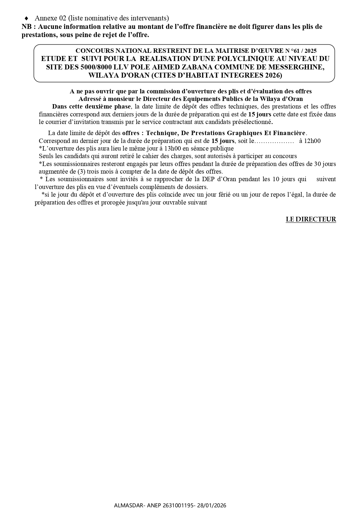 الزبون: DIRECTION DES EQUIPEMENTS PUBLICS DE LA WILAYA D’ORAN رقم ANEP 2631001195 تاريخ النشر: 2026-01-28 عدد الصفحات: 3/4