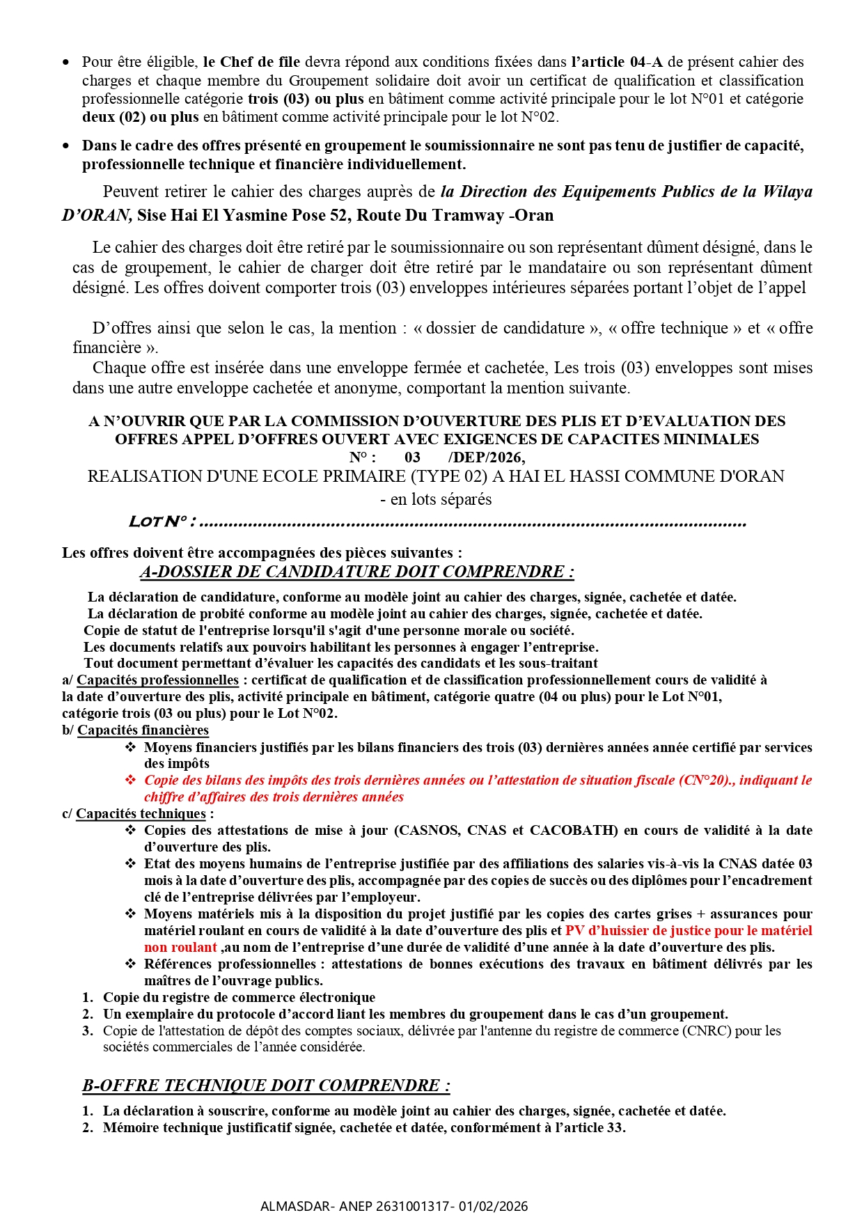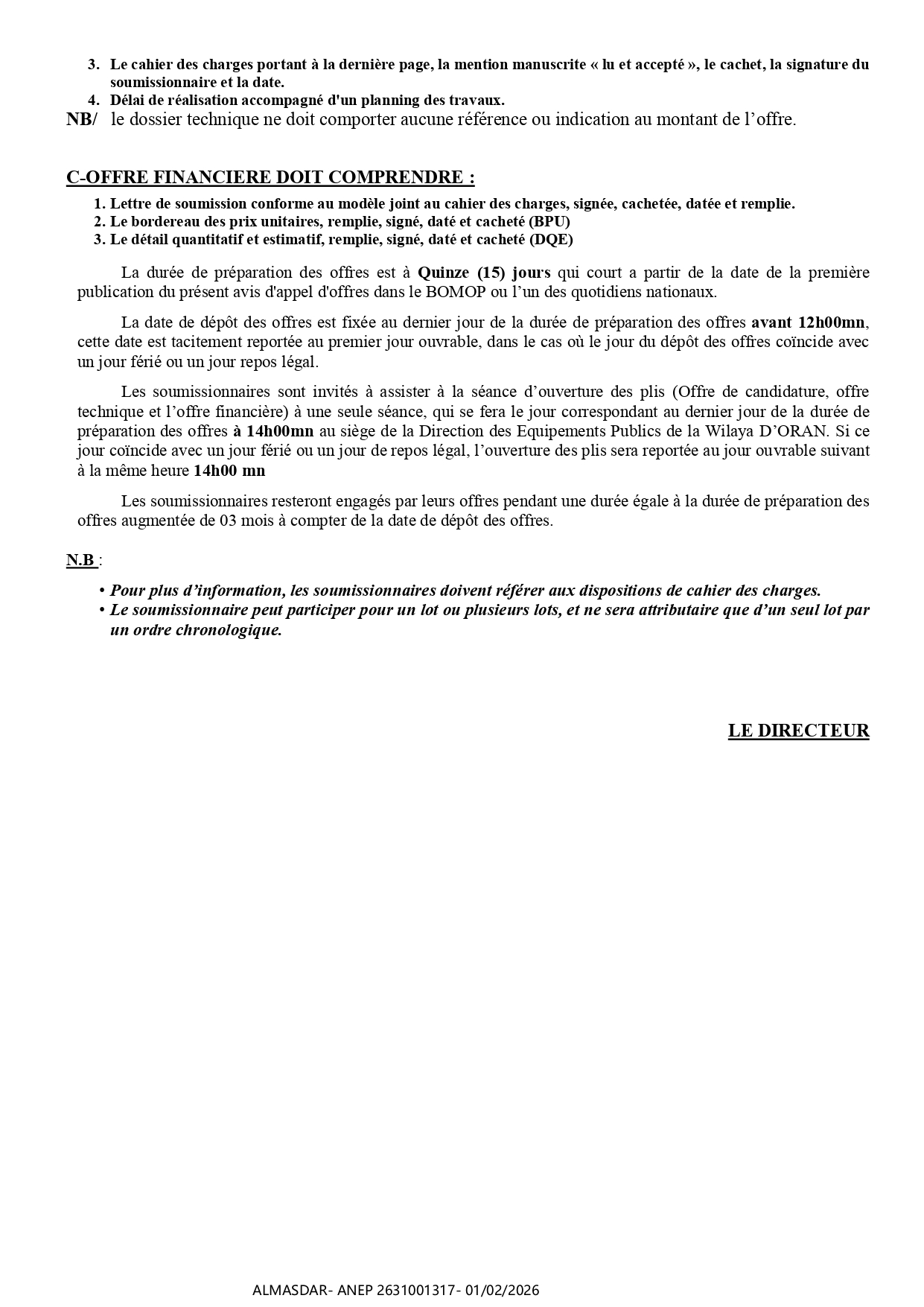 الزبون: DIRECTION DES EQUIPEMENTS PUBLICS WILAYA D’ORAN رقم ANEP 2631001317 تاريخ النشر: 2026-02-01 عدد الصفحات: 3/4