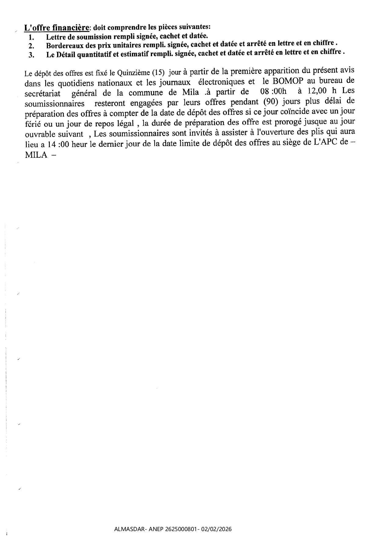 الزبون: COMMUNE DE MILA WILAYA DE MILA رقم ANEP 2625000801 تاريخ النشر: 2026-02-02 عدد الصفحات: 1/2