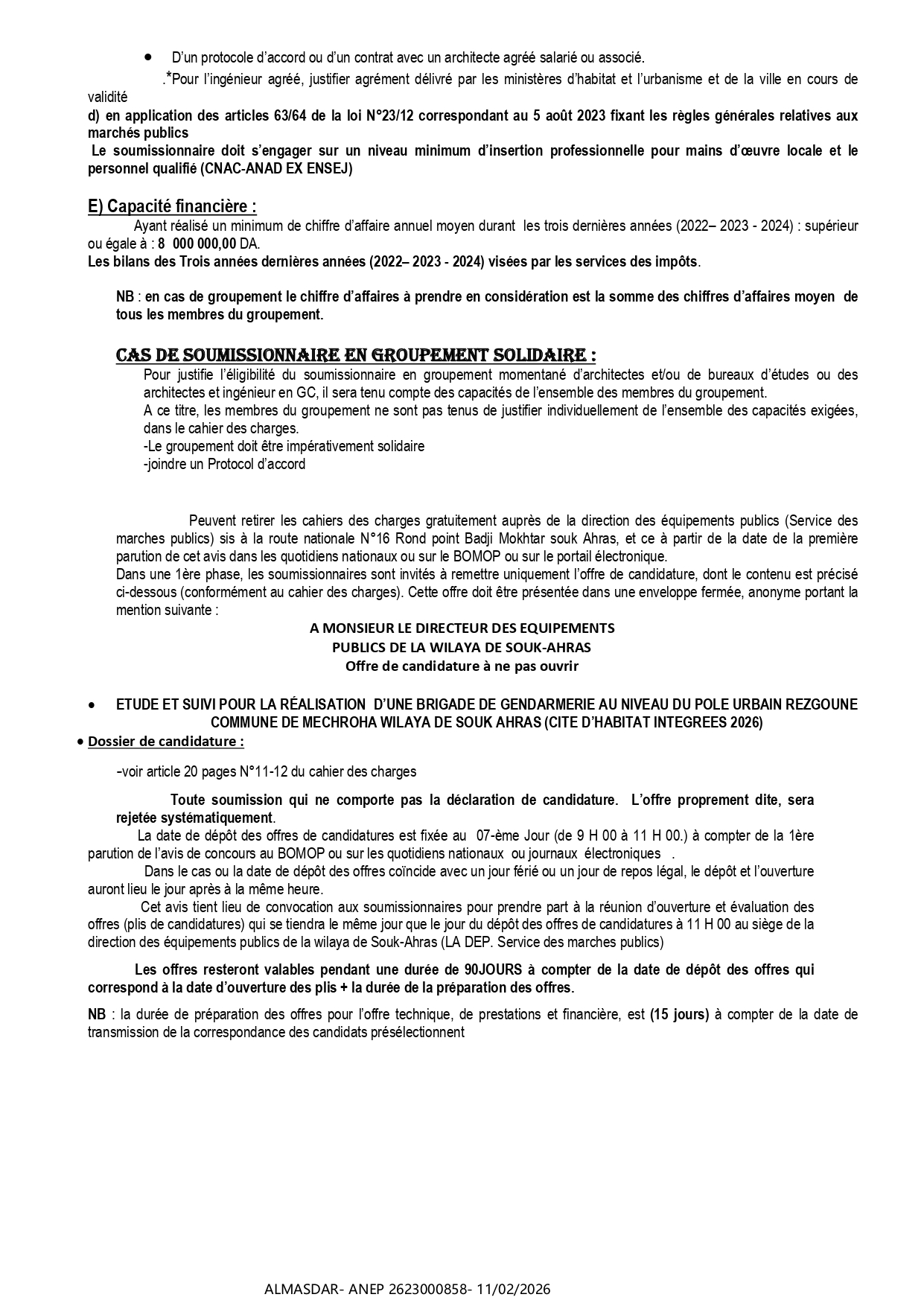 الزبون: DIRECTION DES EQUIPEMENTS PUBLICS DE LA WILAYA DE SOUK-AHRAS رقم ANEP 2623000858 تاريخ النشر: 2026-02-11 عدد الصفحات: 1/2