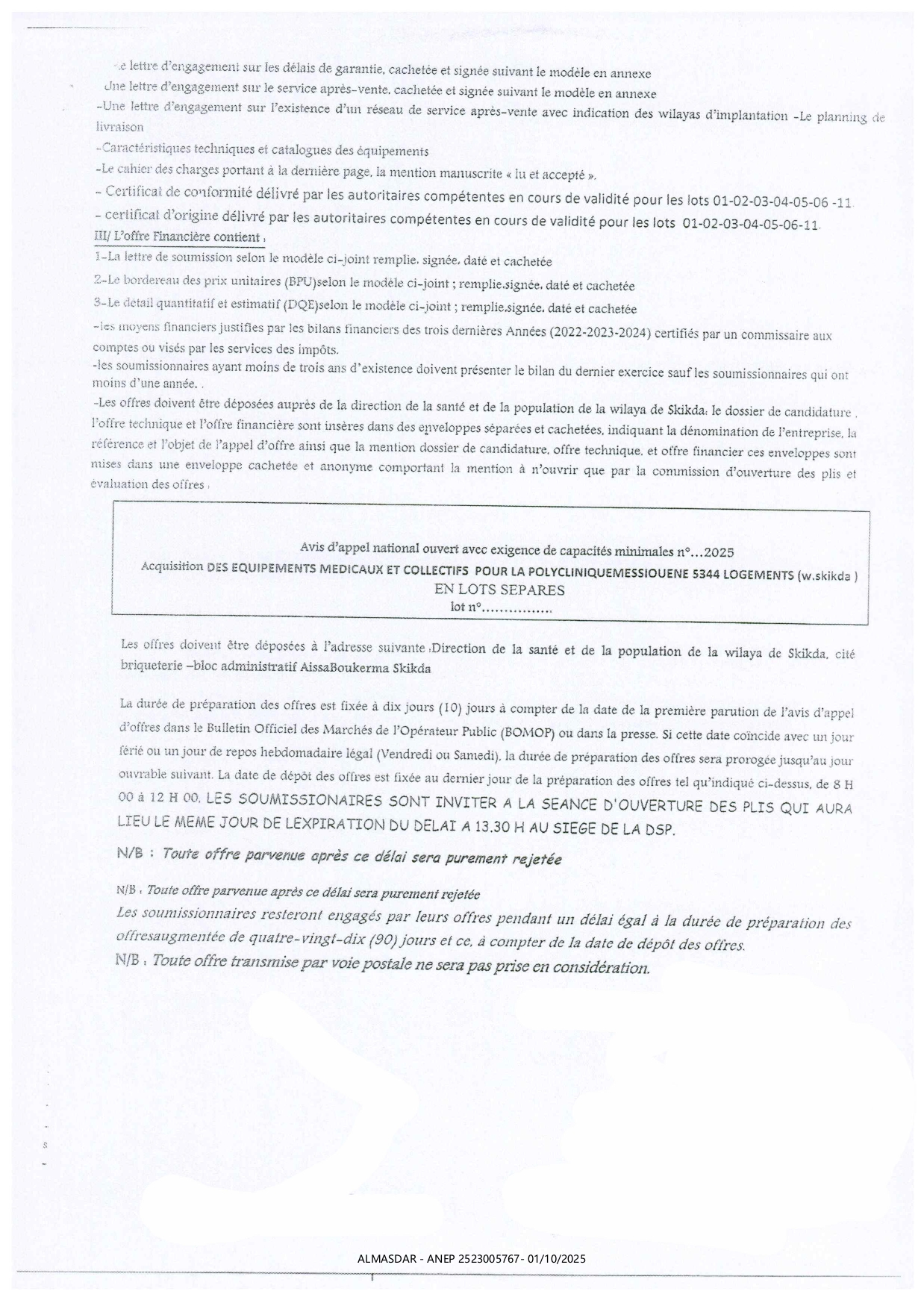 l'acquisition des equipements medicaux et collectifs pour la polyclinique messiouene 5344 logements w.skikda en lots separes