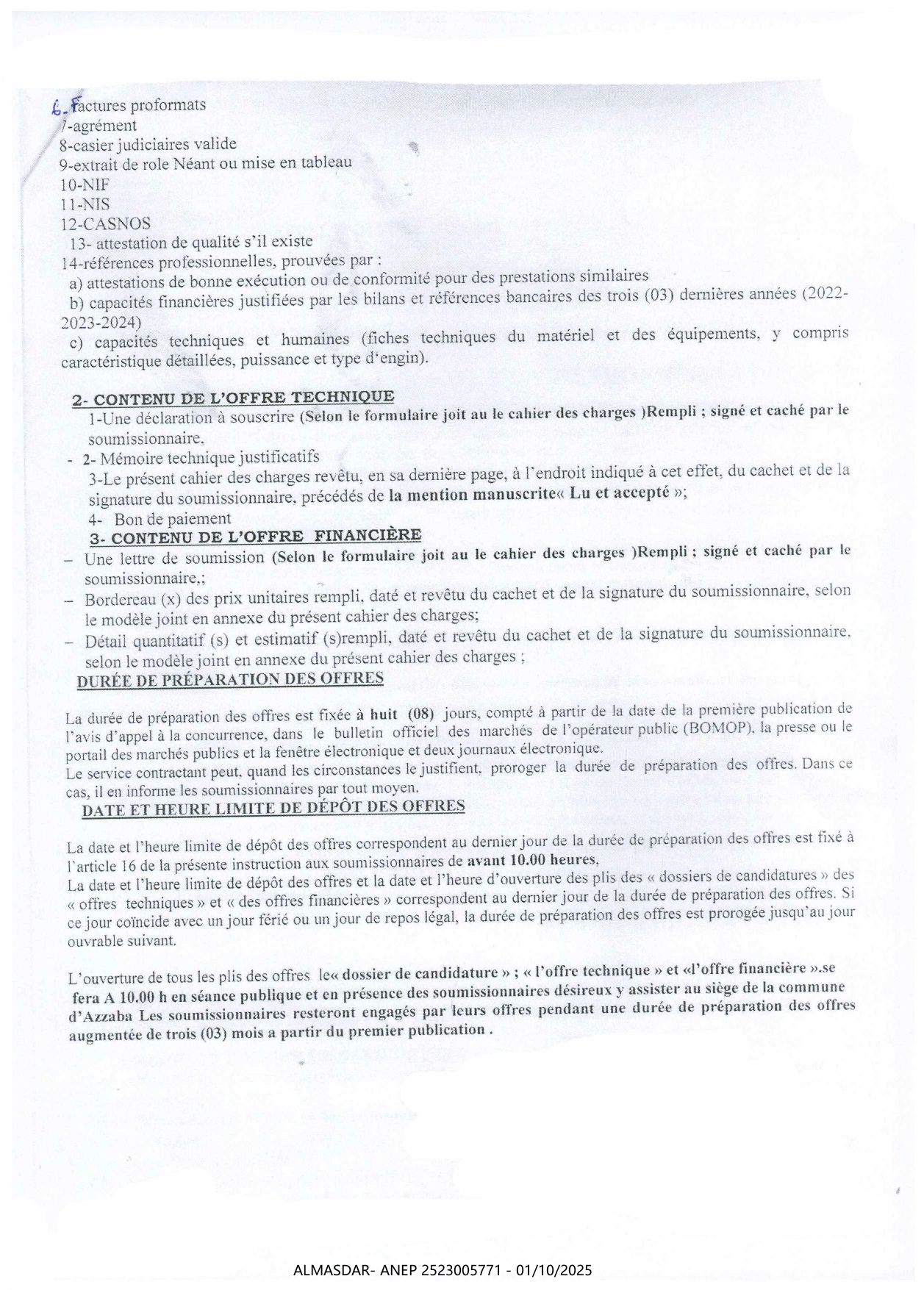 الزبون: COMMUNE AZZABA WILAYA DE SKIKDA رقم ANEP 2523005771 تاريخ النشر: 2025-10-01 عدد الصفحات: 1/2