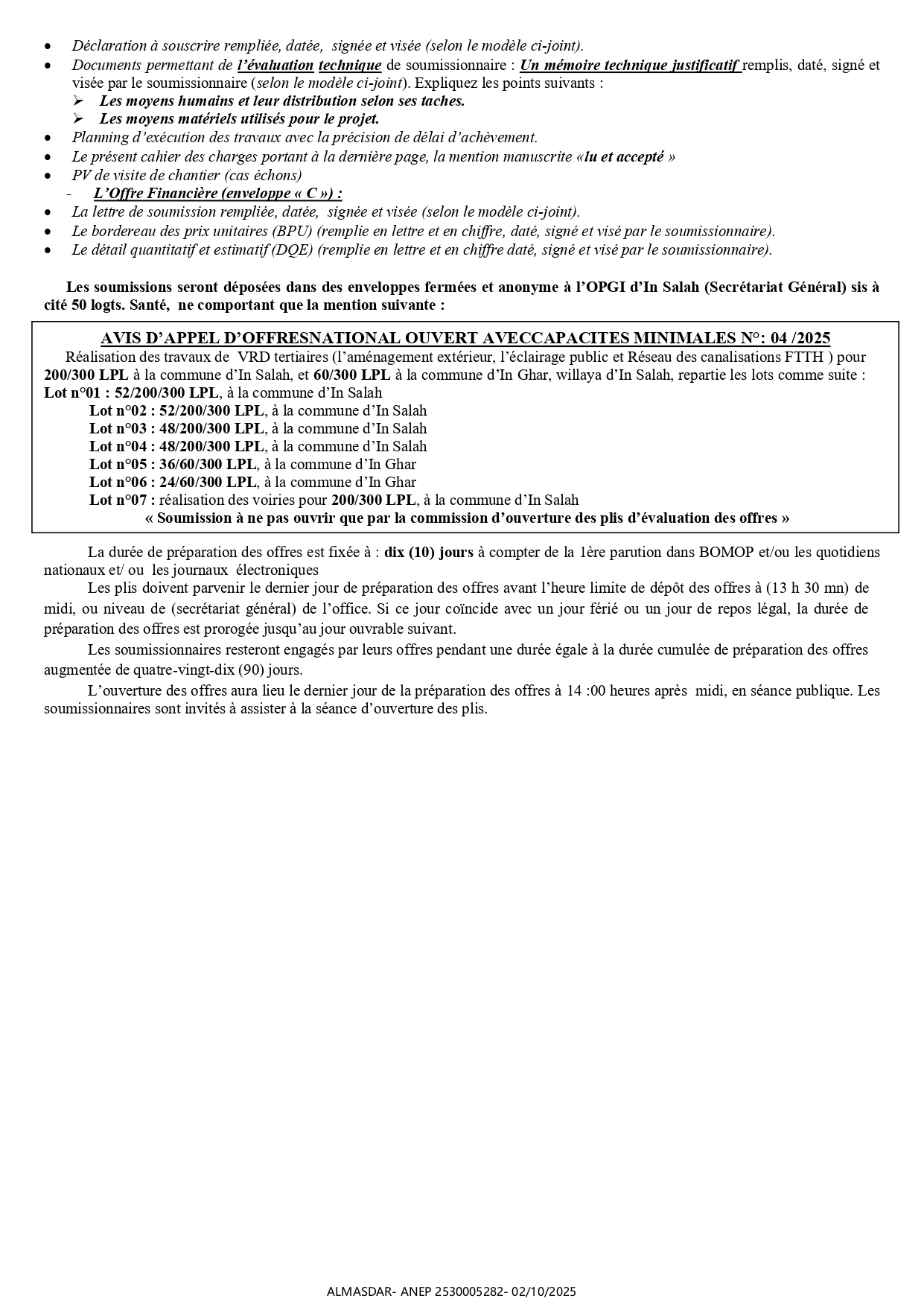 الزبون: opgi d'in salah رقم ANEP 2530005282 تاريخ النشر: 2025-10-02 عدد الصفحات: 1/2
