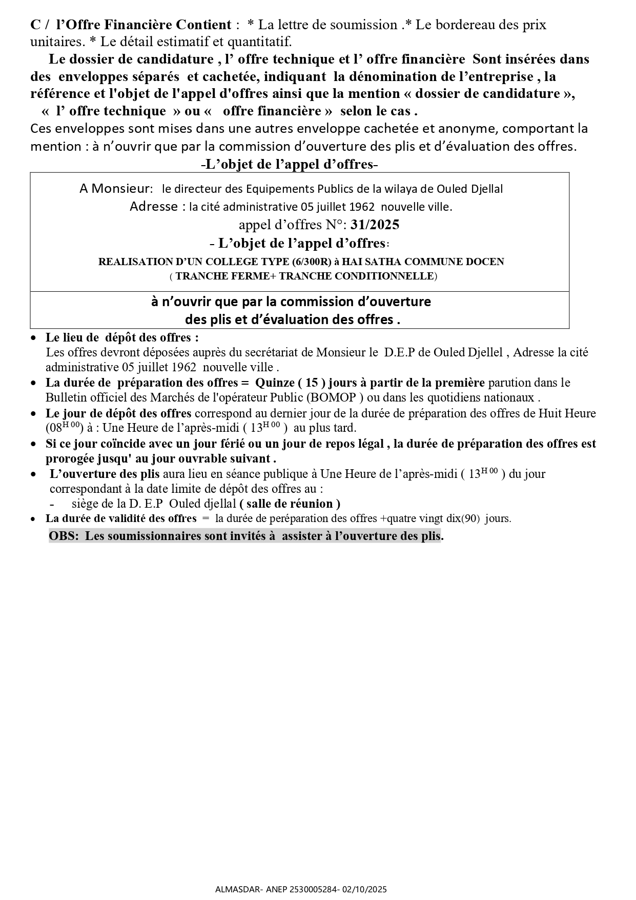 الزبون: DIRECTION DES EQUIPEMENTS PUBLICS DE LA WILAYA DE OULED DJELAL رقم ANEP 2530005284 تاريخ النشر: 2025-10-02 عدد الصفحات: 1/2