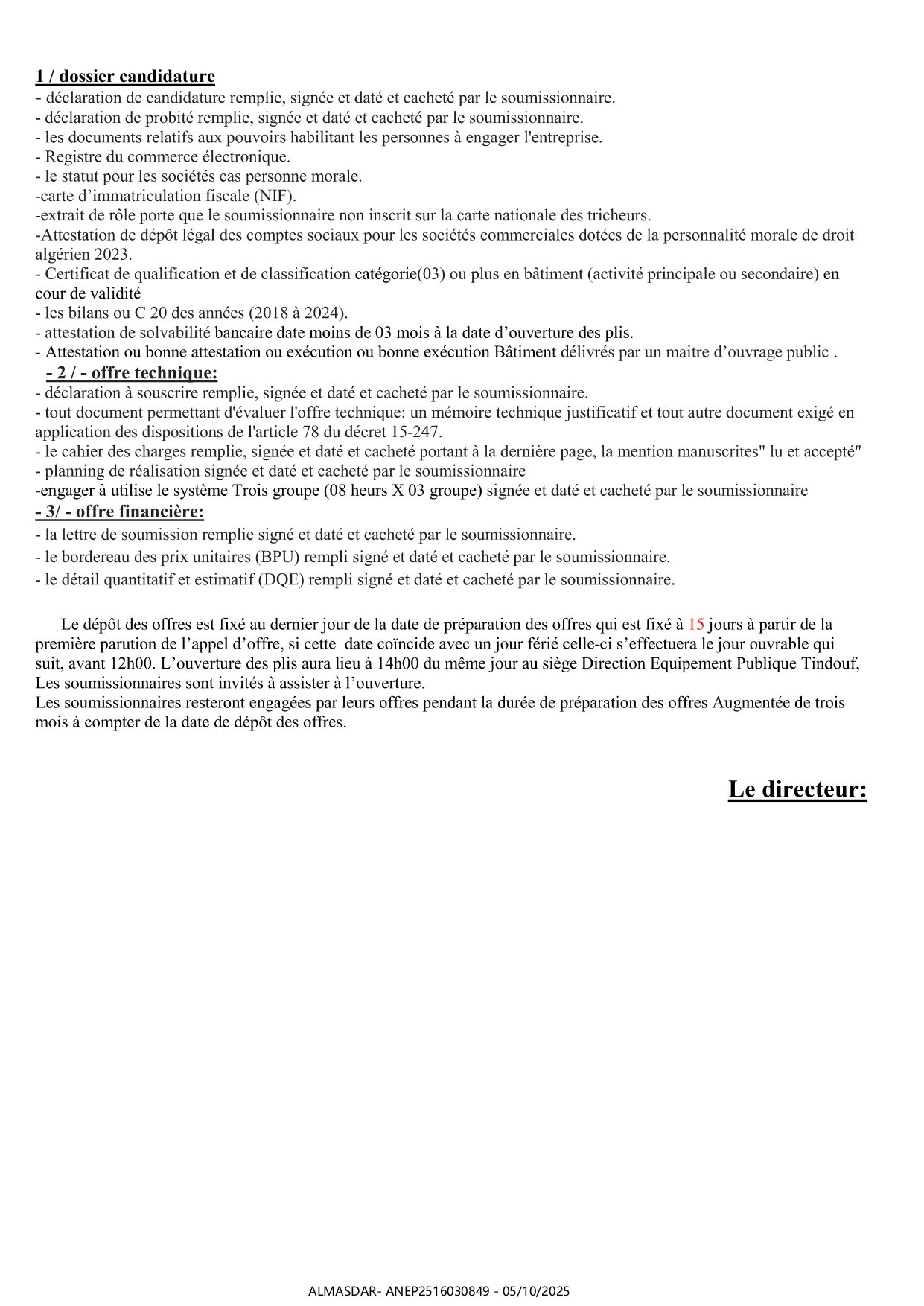 الزبون: direction des équipements publics wilaya TINDOUF رقم ANEP 2516030849 تاريخ النشر: 2025-10-05 عدد الصفحات: 1/2