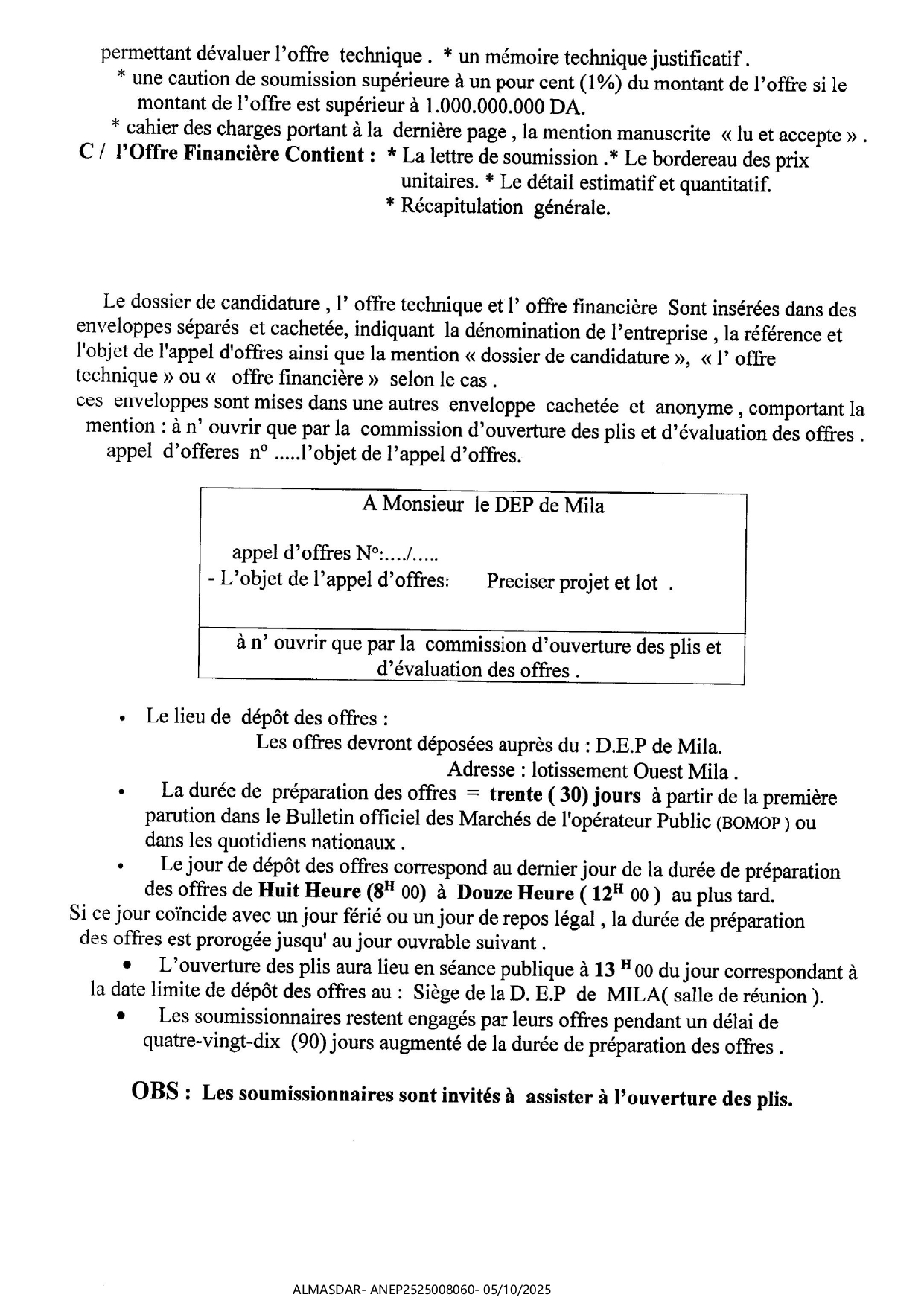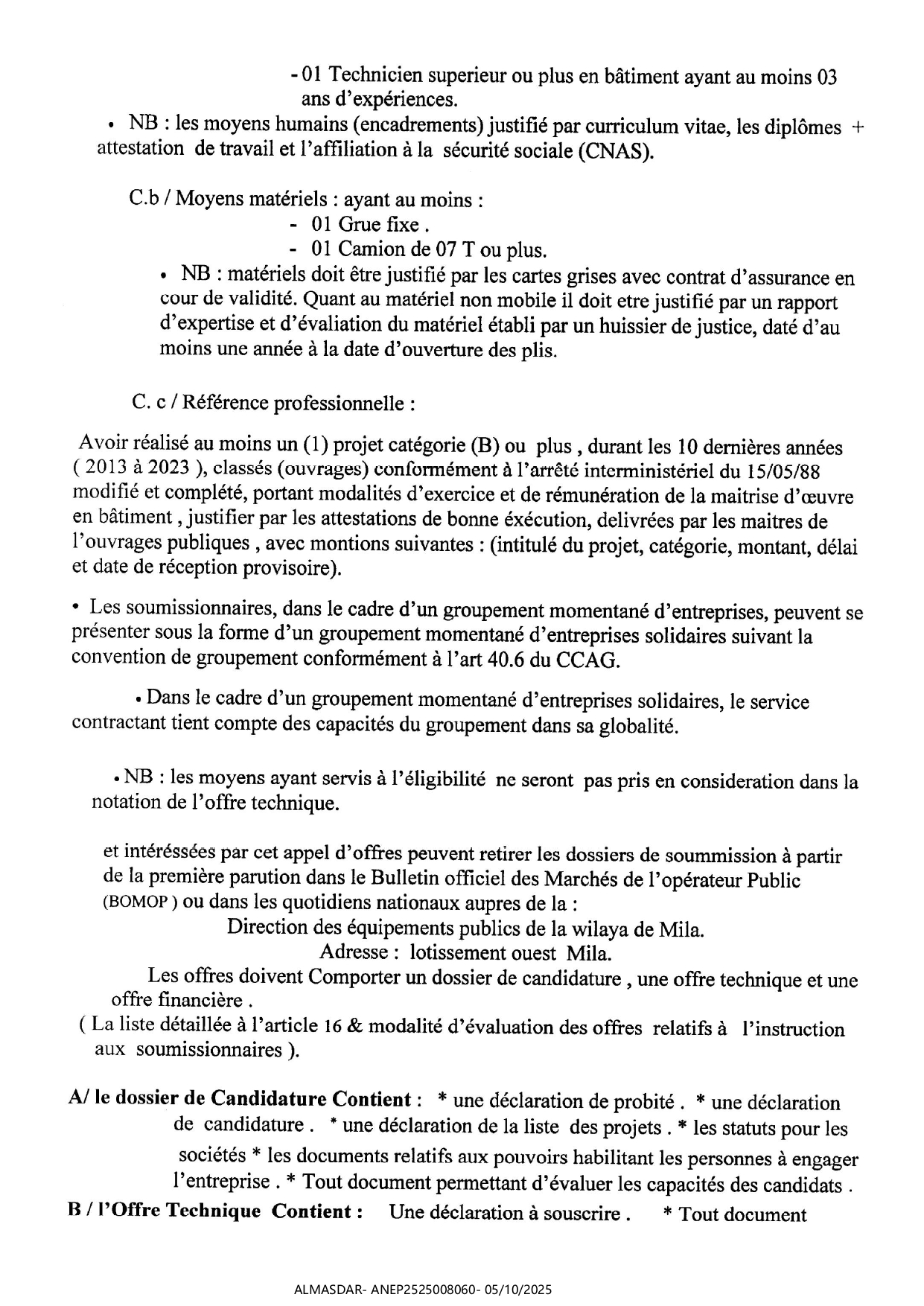 الزبون: DIRECTION DES EQUIPEMENTS PUBLICS DE LA WILAYA DE MILA رقم ANEP 2525008060 تاريخ النشر: 2025-10-05 عدد الصفحات: 3/4