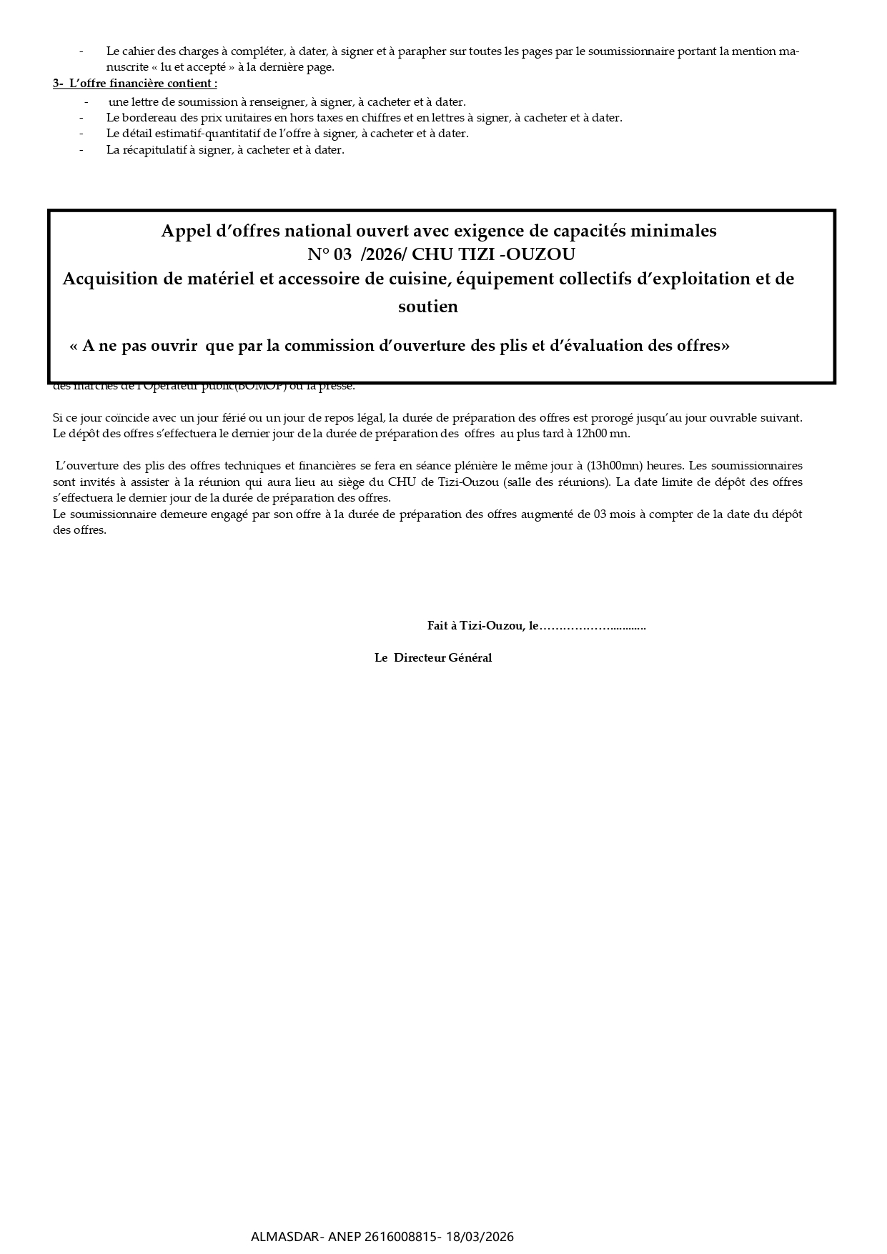الزبون: Le Centre Hospitalo-universitaire De TIZI -OUZOU رقم ANEP 2616008815 تاريخ النشر: 2026-03-18 عدد الصفحات: 1/2