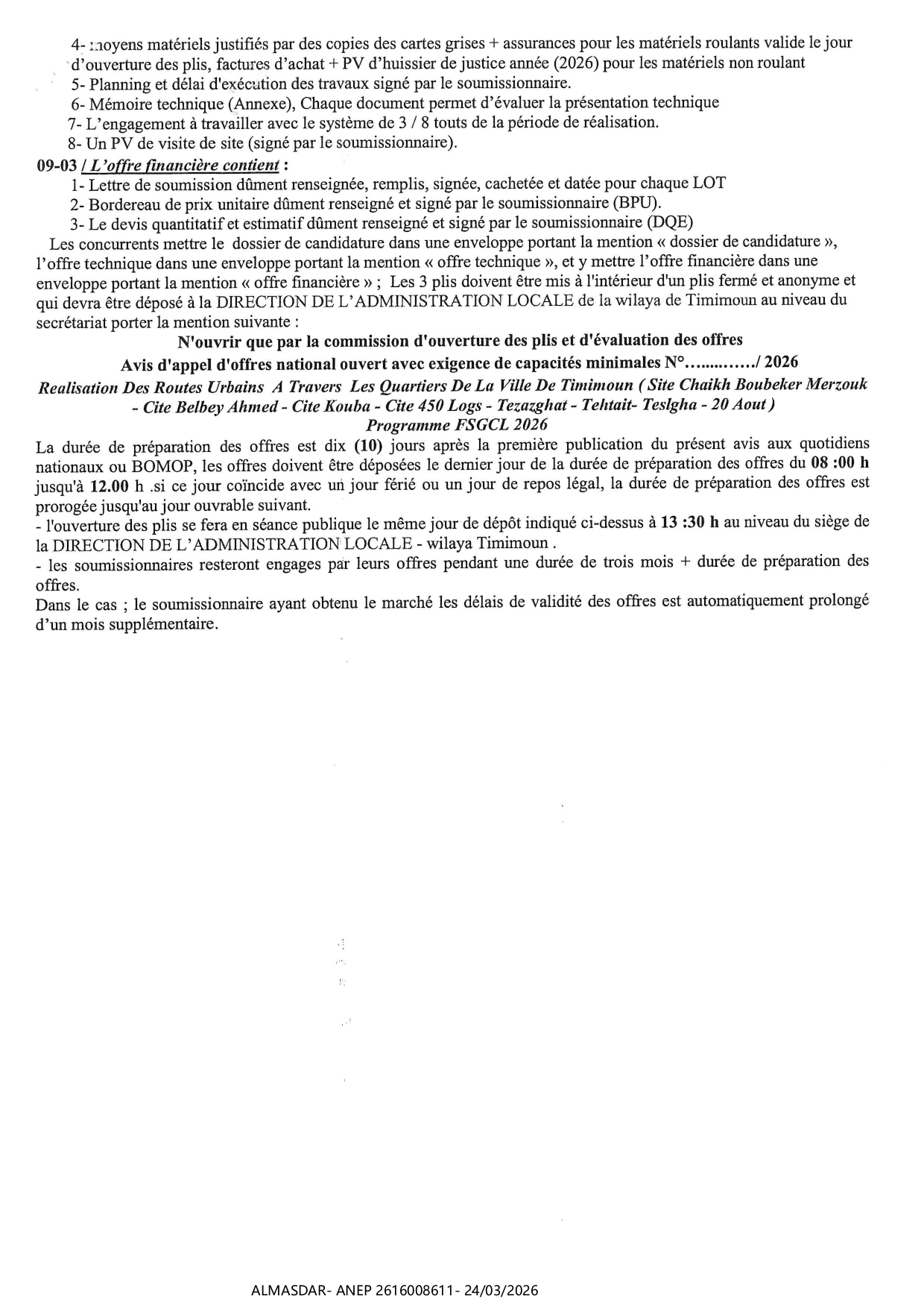 الزبون: direction de l'administration locale wilaya de timimoun رقم ANEP 2616008611 تاريخ النشر: 2026-03-24 عدد الصفحات: 1/2