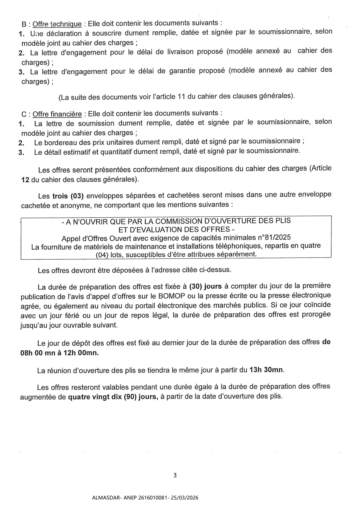 الزبون: DIRECTION GENERAL DE LA SURETE NATIONALE رقم ANEP 2616010081 تاريخ النشر: 2026-03-25 عدد الصفحات: 1/2