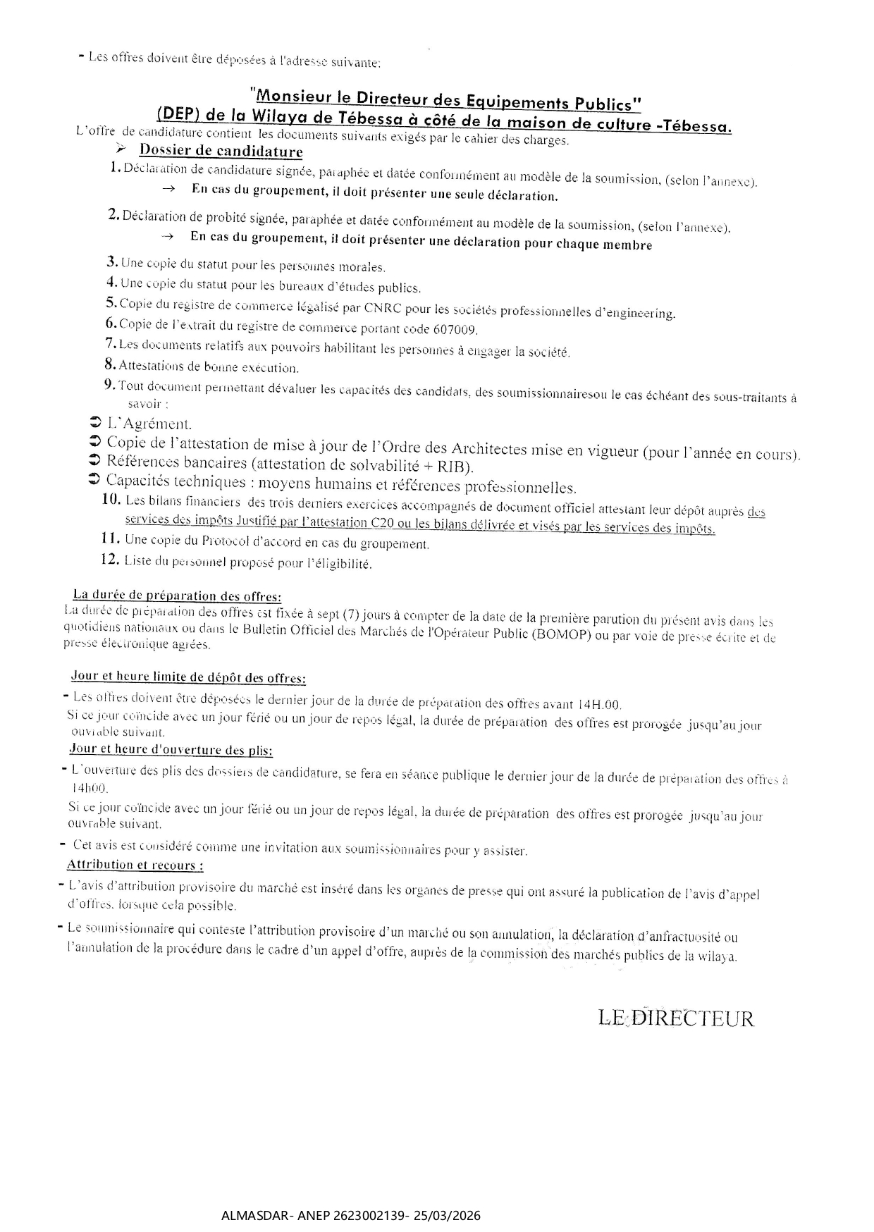 الزبون: direction des equipements publics de la wilaya de tebessa رقم ANEP 2623002139 تاريخ النشر: 2026-03-25 عدد الصفحات: 1/2