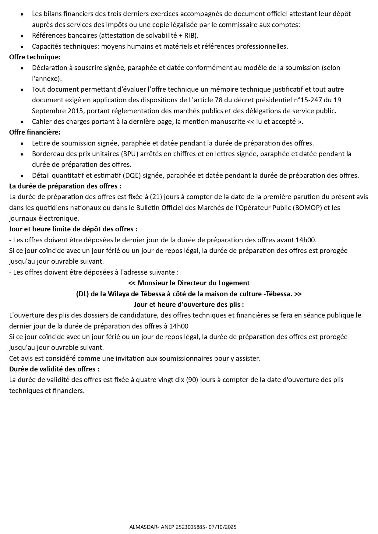 الزبون: DIRECTION DU LOGEMENT WILAYA DE TEBESSAA رقم ANEP 2523005885 تاريخ النشر: 2025-10-07 عدد الصفحات: 1/2