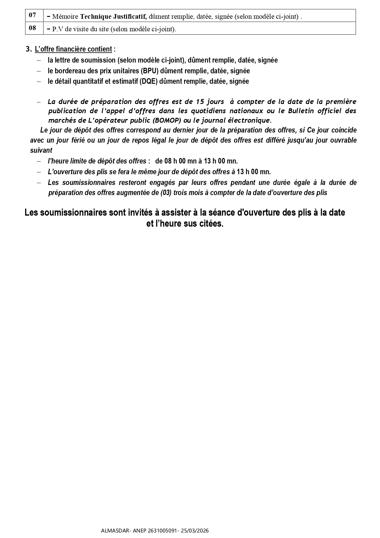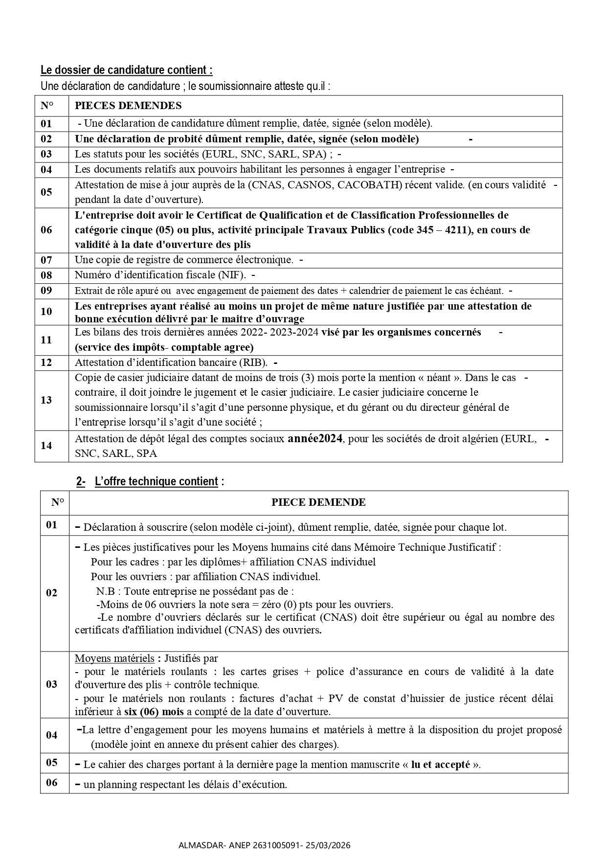 الزبون: Wilaya de RELIZANE Direction des travaux Publics رقم ANEP 2631005091 تاريخ النشر: 2026-03-25 عدد الصفحات: 3/4