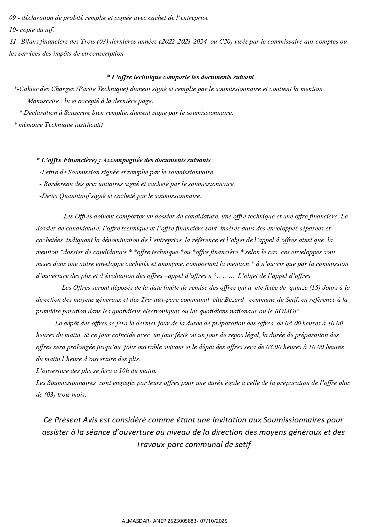 الزبون: COMMUNE DE SETIF WILAYA DE SETIF رقم ANEP 2523005883 تاريخ النشر: 2025-10-07 عدد الصفحات: 1/2