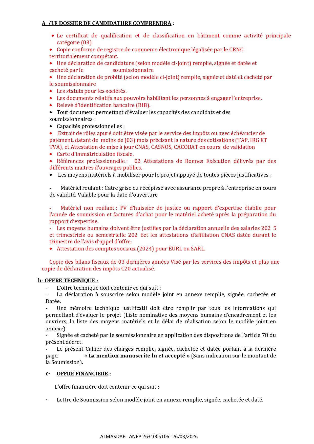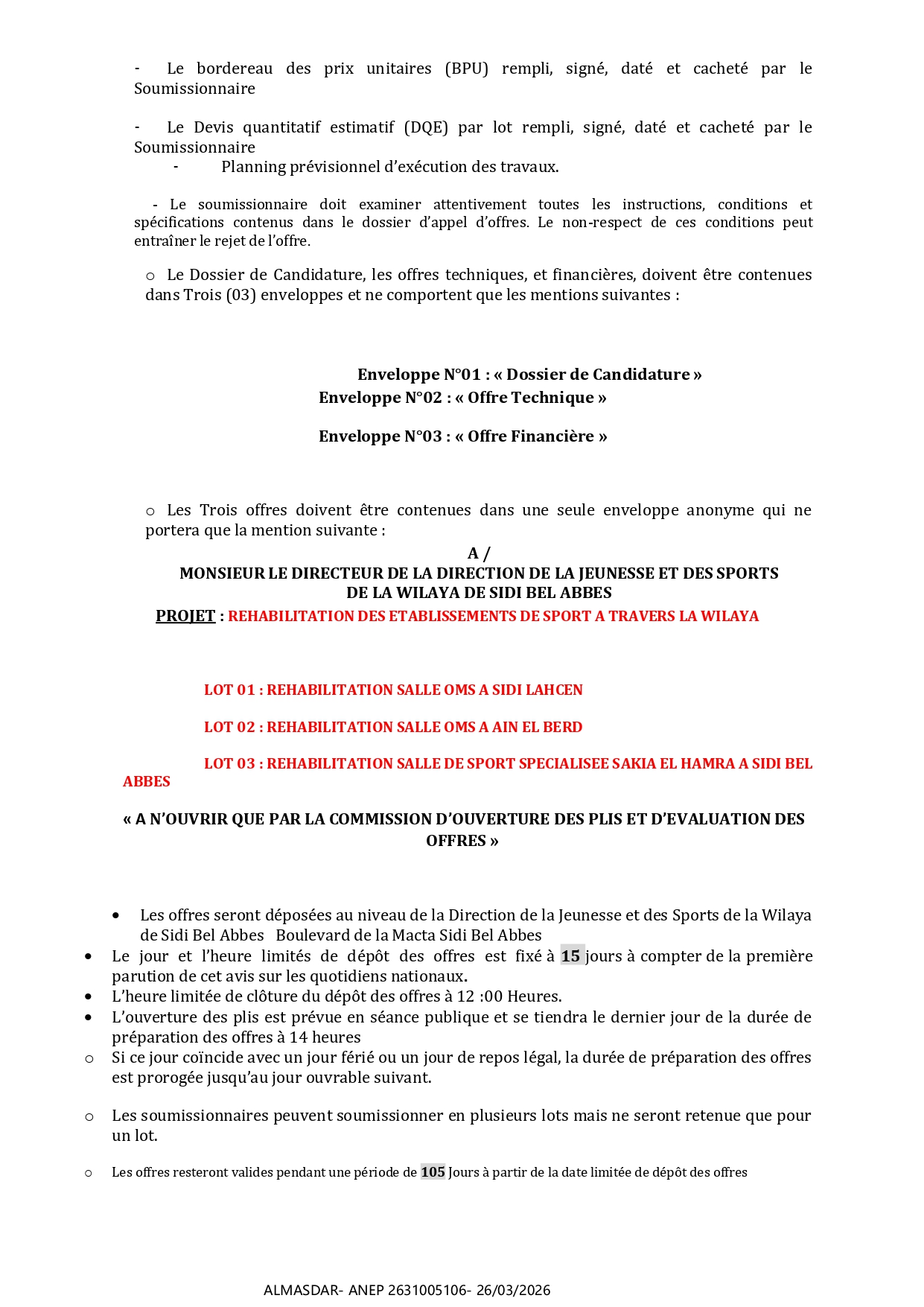 الزبون: WILAYA DE SIDI BEL ABBES DIRECTION DE LA JEUNESSE ET SPORTS رقم ANEP 2631005106 تاريخ النشر: 2026-03-26 عدد الصفحات: 3/4