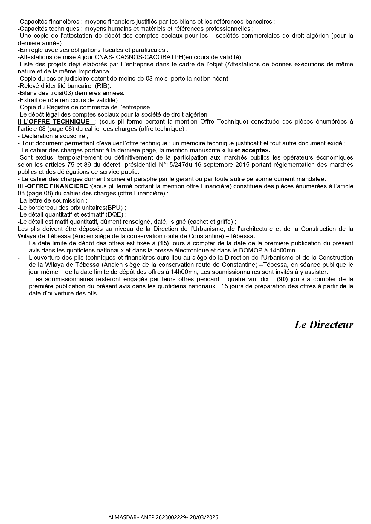 الزبون: DIRECTION DE L’URBANISME D’ARCHITECTURE ET DE LA CONSTRUCTION DE LA WILAYA DE TEBESSA رقم ANEP 2623002229 تاريخ النشر: 2026-03-28 عدد الصفحات: 1/2