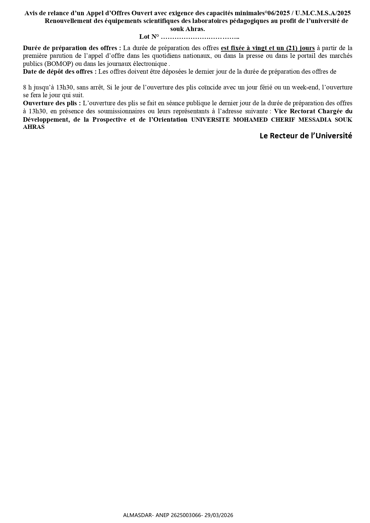 الزبون: universite mohamed cherif messadia souk-ahras رقم ANEP 2625003066 تاريخ النشر: 2026-03-29 عدد الصفحات: 1/2