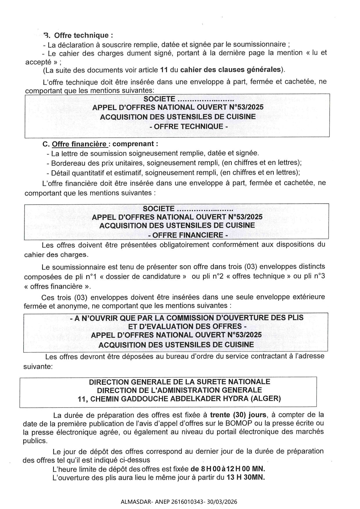 الزبون: direction general de la surete nationalle رقم ANEP 2616010343 تاريخ النشر: 2026-03-30 عدد الصفحات: 3/4