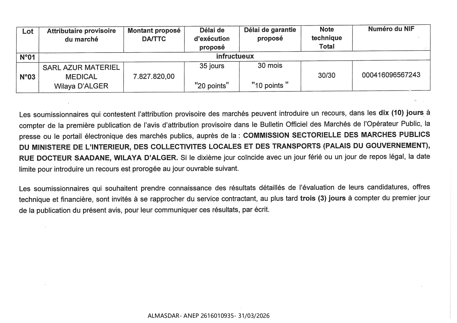 الزبون: DIRECTION GENERALE DE LA SURETE NATIONALES رقم ANEP 2616010935 تاريخ النشر: 2026-03-31 عدد الصفحات: 1/2