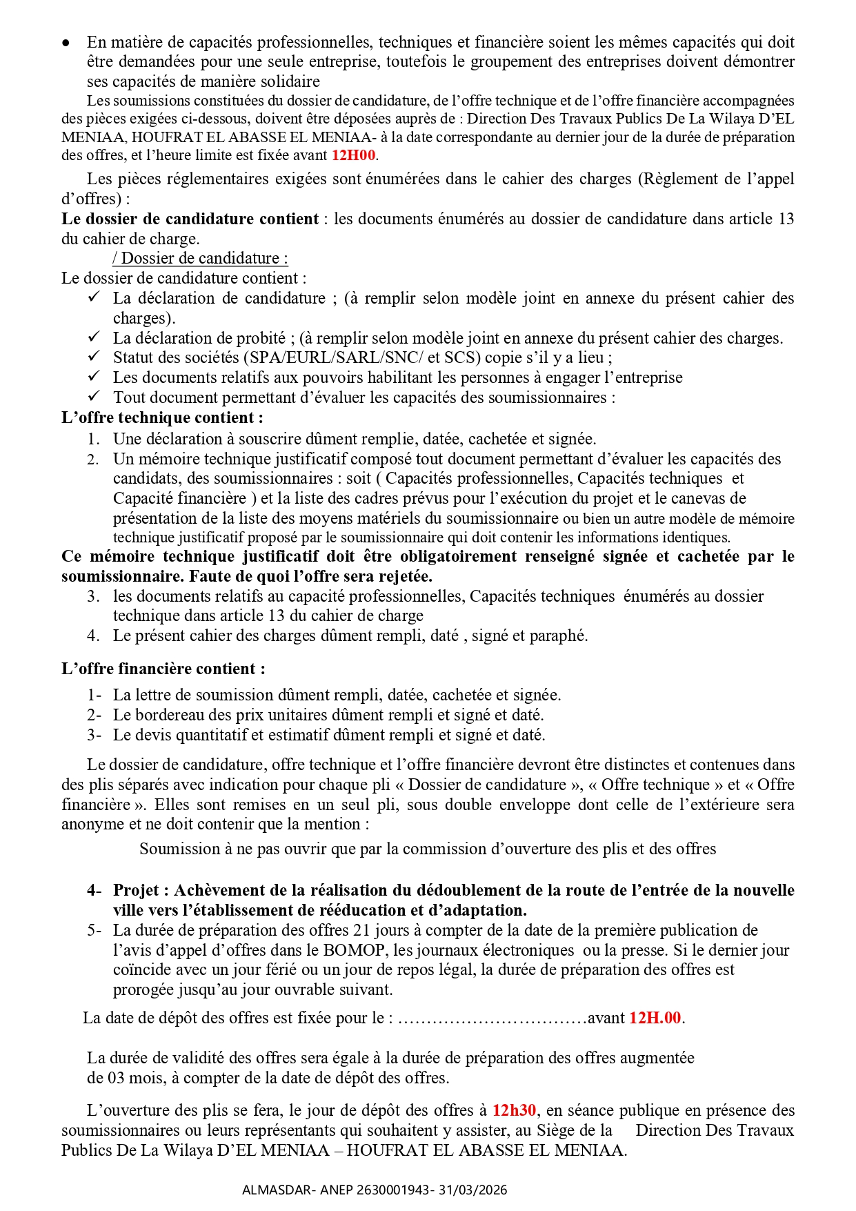 الزبون: DIRECTION DES TRAVAUX PUBLICS DE LA WILAYA D’EL MENIAA رقم ANEP 2630001943 تاريخ النشر: 2026-03-31 عدد الصفحات: 1/2