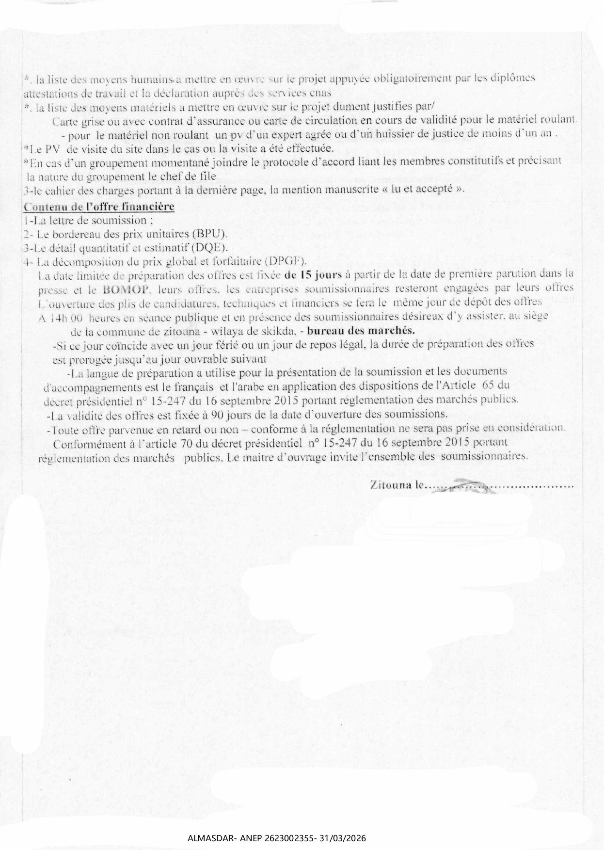 الزبون: COMMUNE DE ZITOUNA WILAYA DE SKIKDA رقم ANEP 2623002355 تاريخ النشر: 2026-03-31 عدد الصفحات: 1/2