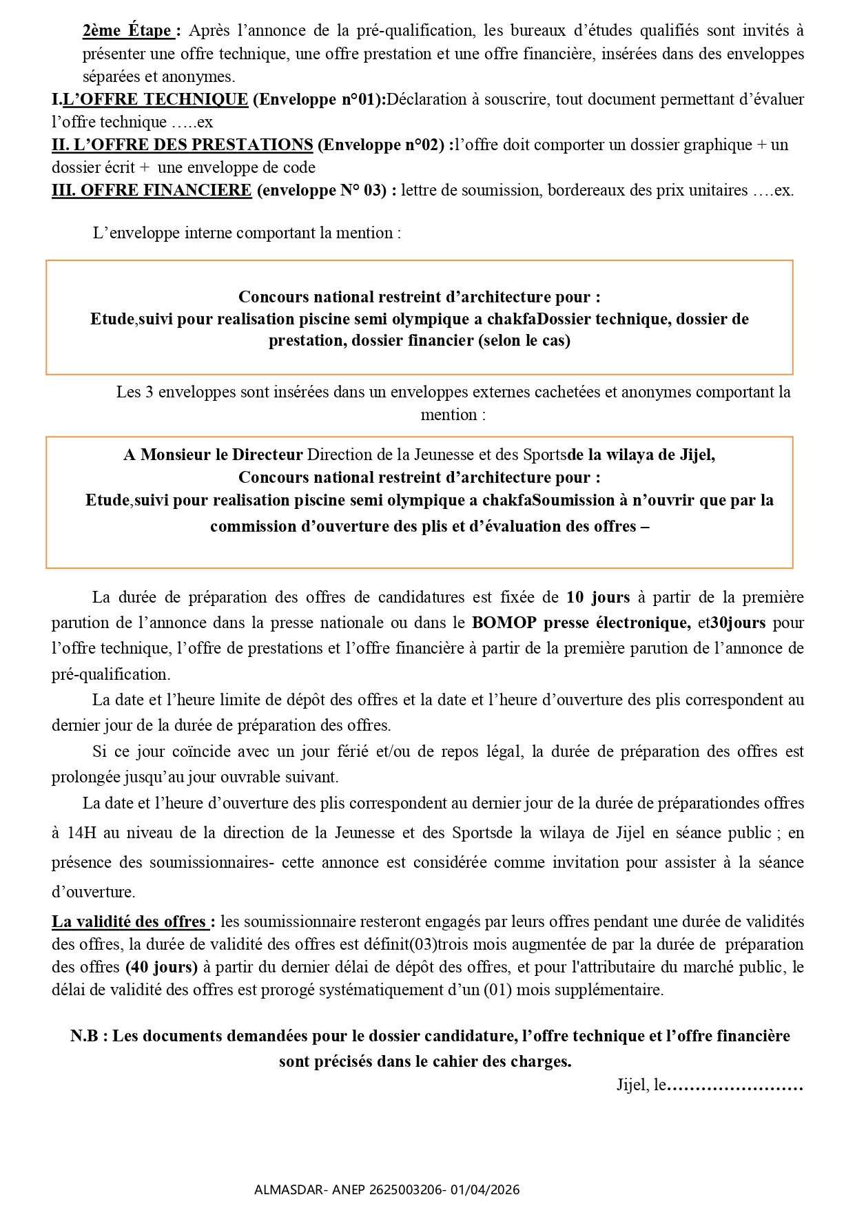الزبون: WILAYA DE JIJEL Direction de la Jeunesse et des Sports رقم ANEP 2625003206 تاريخ النشر: 2026-04-01 عدد الصفحات: 1/2
