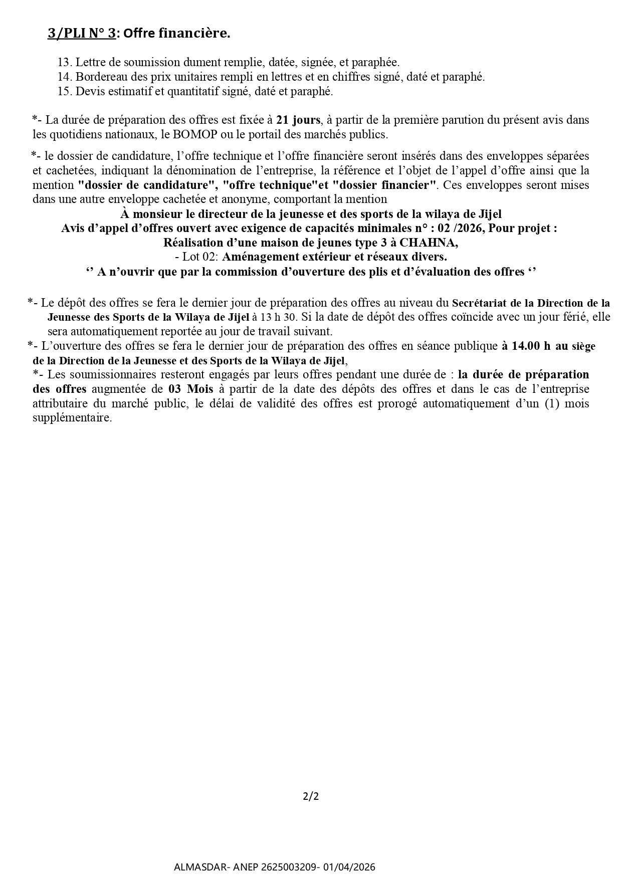 الزبون: direction de la jeunesse et des sports wilaya de jijel رقم ANEP 2625003209 تاريخ النشر: 2026-04-01 عدد الصفحات: 1/2