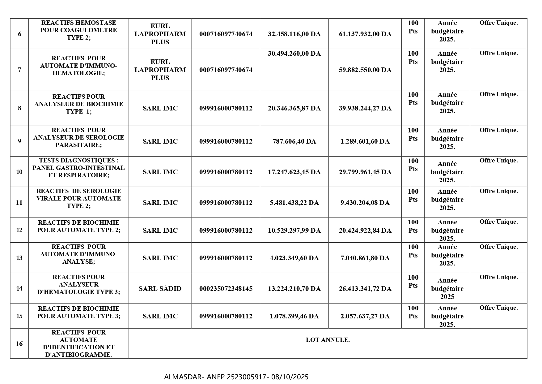 fourniture de réactifs de biochimie-hémobiologie au profit du CHU annaba durant l'année budgétaire 2025; repartis en 16 lots