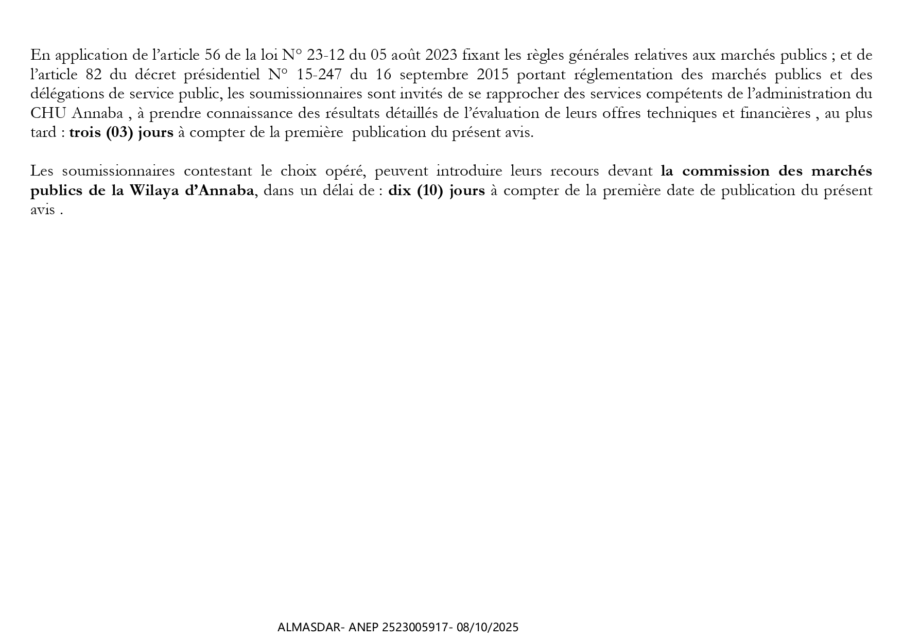 الزبون: CENTRE HOSPITALO-UNIVERSITAIRE D'ANNABA رقم ANEP 2523005917 تاريخ النشر: 2025-10-08 عدد الصفحات: 3/4