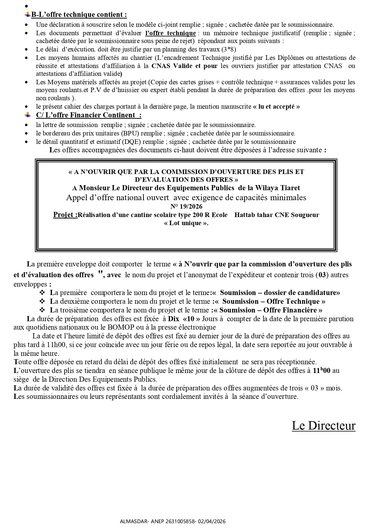الزبون: DIRECTION DES EQUIPEMENTS PUBLICS DE LA WILAYA DE TIARET رقم ANEP 2631005858 تاريخ النشر: 2026-04-02 عدد الصفحات: 1/2
