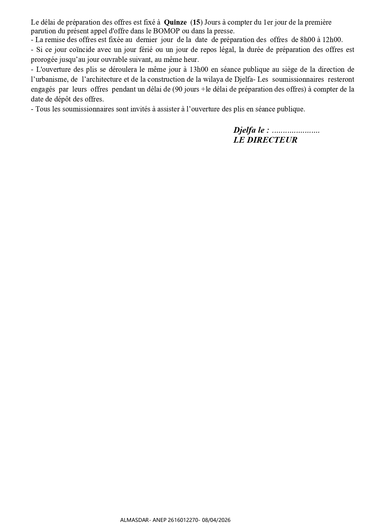 الزبون: DIRECTION DE L’URBANISME ET DE L’ARCHITECTURE ET DE LA CONSTRUCTION DE LA WILAYA DE DJELFA رقم ANEP 2616012270 تاريخ النشر: 2026-04-08 عدد الصفحات: 1/2