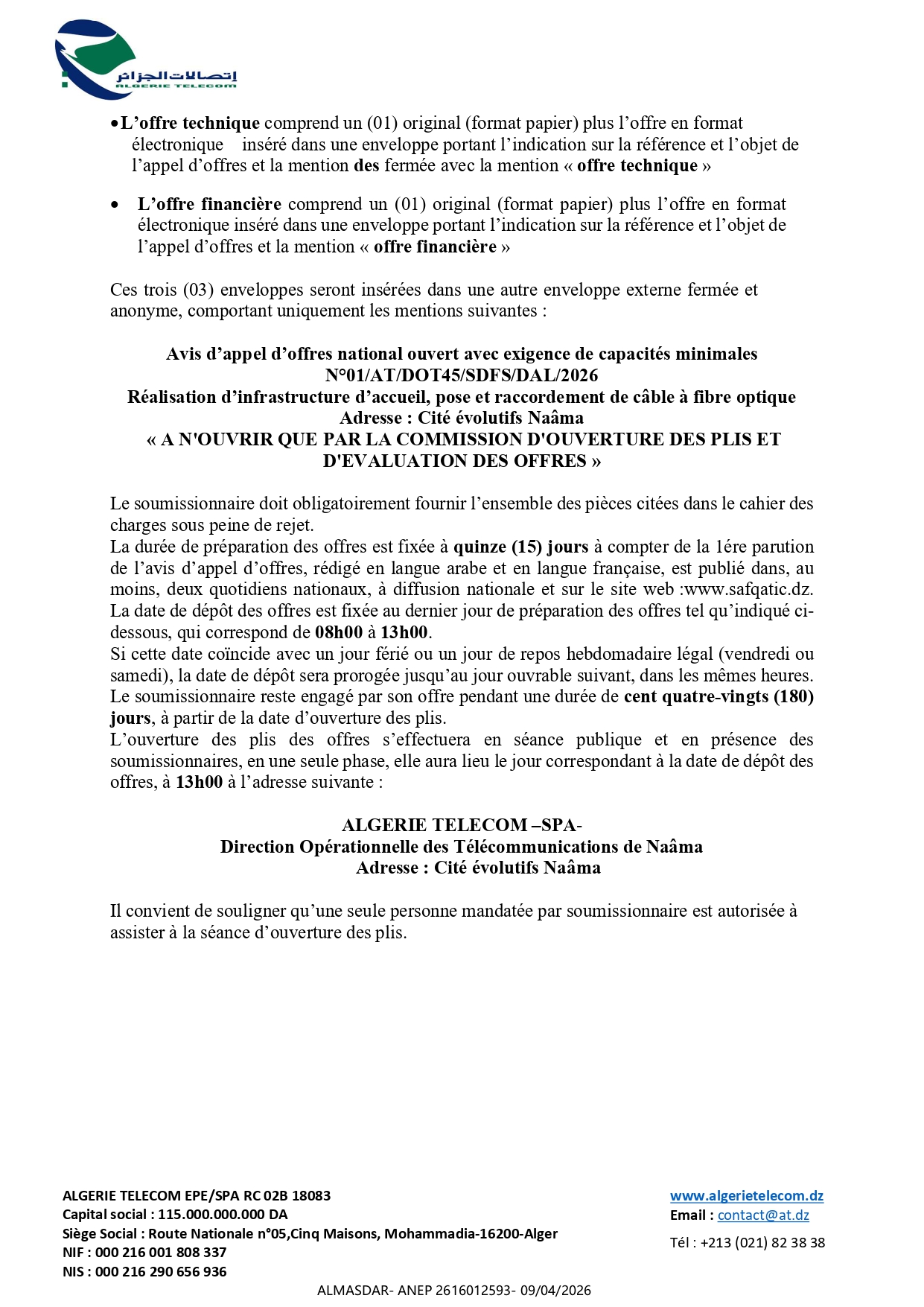 الزبون: Direction Opérationnelle des Télécommunications de Naâma رقم ANEP 2616012593 تاريخ النشر: 2026-04-09 عدد الصفحات: 1/2