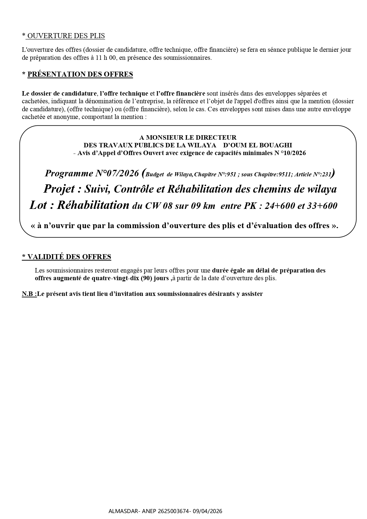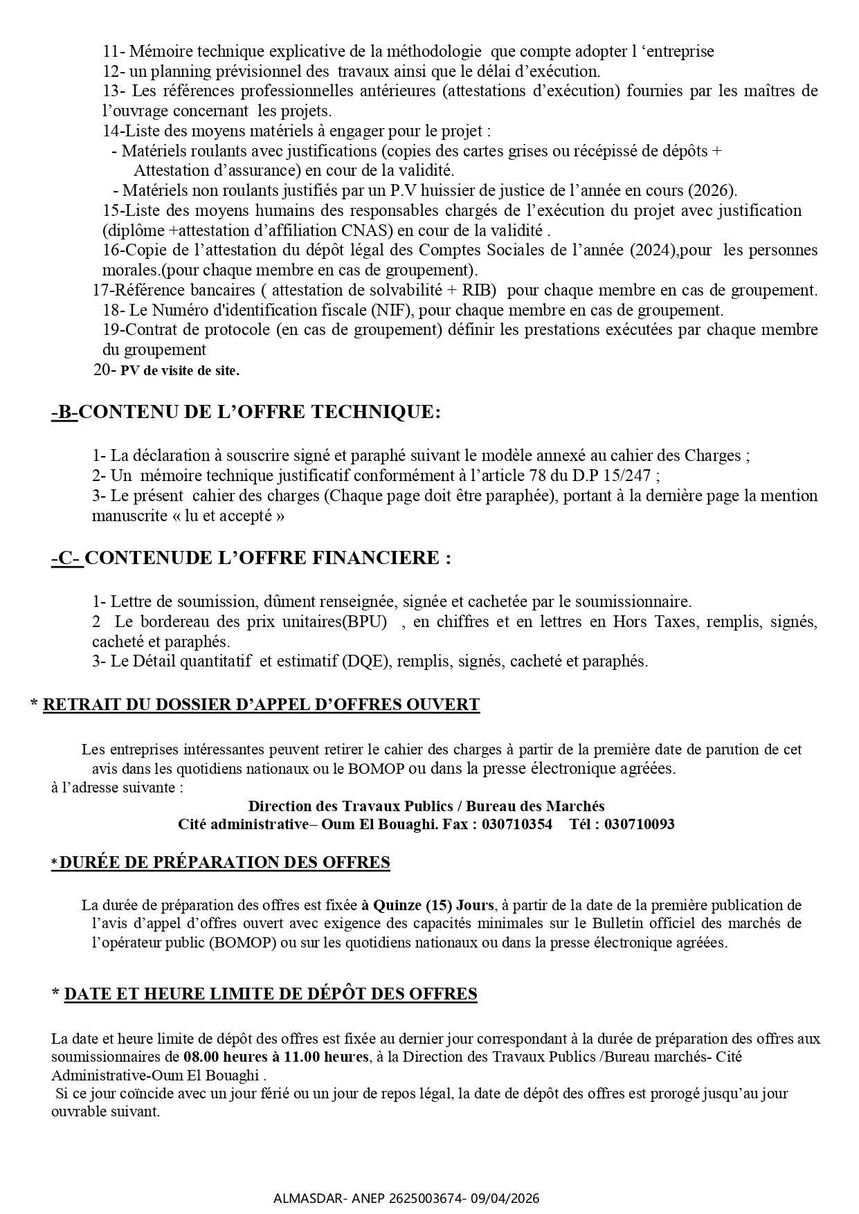 الزبون: WILAYA D’OUM EL BOUAGHI DIRECTION DES TRAVAUX PUBLICS رقم ANEP 2625003674 تاريخ النشر: 2026-04-09 عدد الصفحات: 3/4