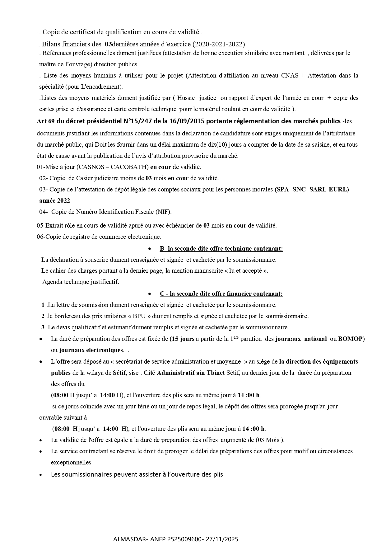 الزبون: IF DIRECTION DES EQUIPEMENTS PUBLICS رقم ANEP 2525009600 تاريخ النشر: 2025-11-27 عدد الصفحات: 1/2