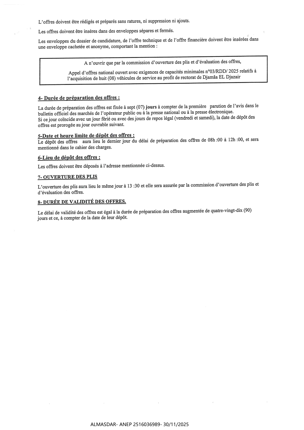 الزبون: RECTORAT DE DJAMAA EL DJAZAIR رقم ANEP 2516036989 تاريخ النشر: 2025-11-30 عدد الصفحات: 1/2
