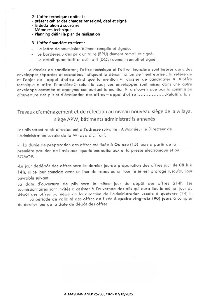 الزبون: DIRECTION DE L'ADMINISTRATIO? LOCALE WILAYA D'EL TARF رقم ANEP 2523007161 تاريخ النشر: 2025-12-07 عدد الصفحات: 1/2