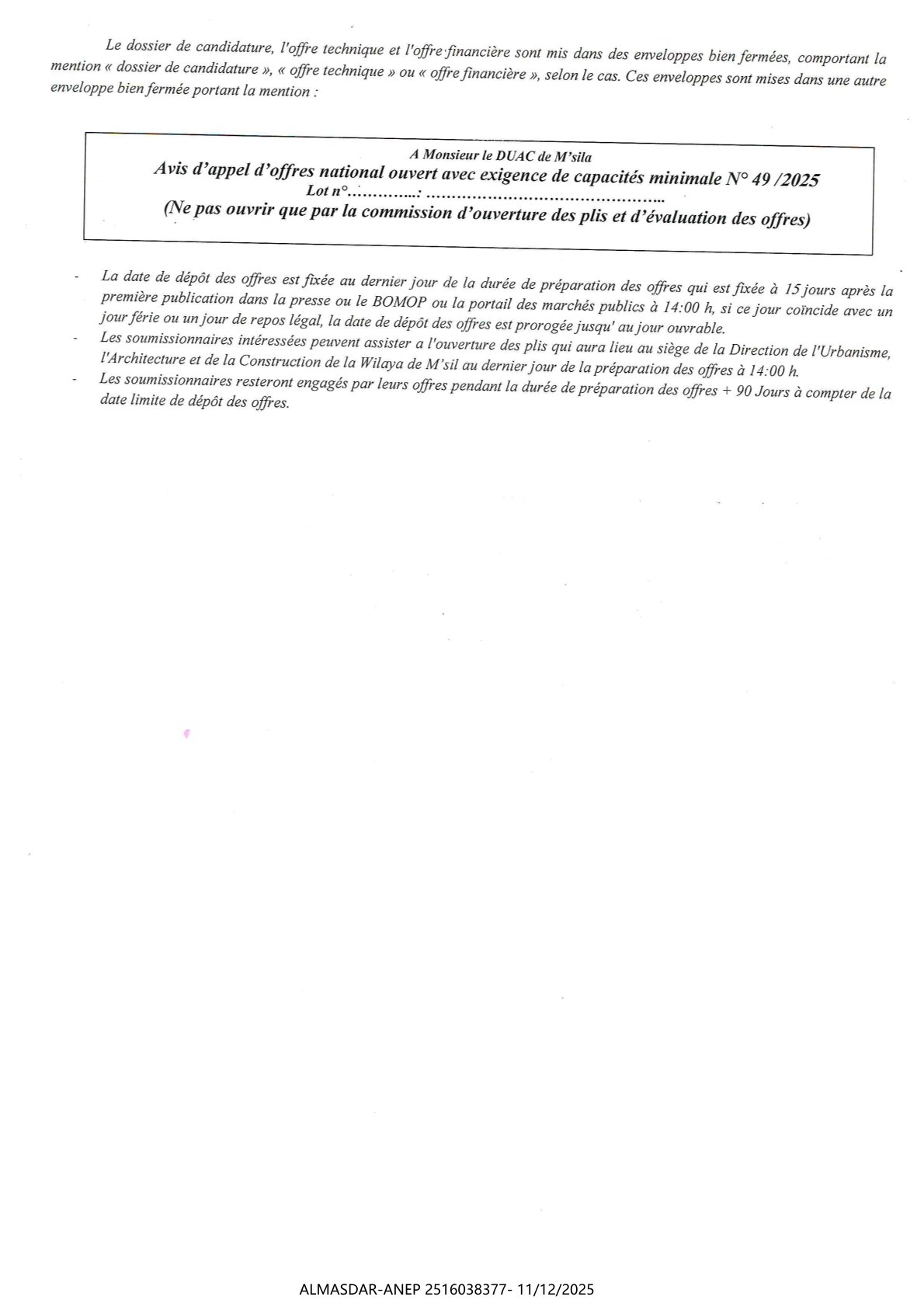 الزبون: DIRECTION DE L'URBANISME DE L'ARCHITECTURE ET DE LA CONSTRUCTION DE LA WILAYA DE M'SILA رقم ANEP 2516038377 تاريخ النشر: 2025-12-11 عدد الصفحات: 1/2