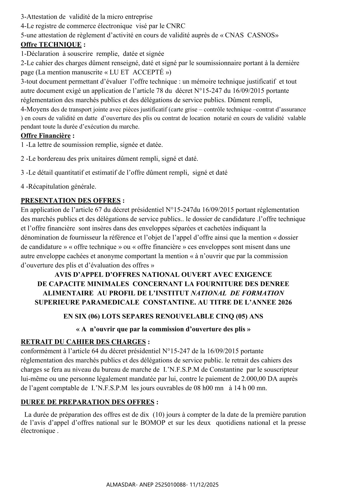 الزبون: INSTITUT NATIONAL DE FORMATION SUPERIEURE PARAMEDICALE LAHMAR ABDELKADER- CONSTANTINE. رقم ANEP 2525010088 تاريخ النشر: 2025-12-11 عدد الصفحات: 1