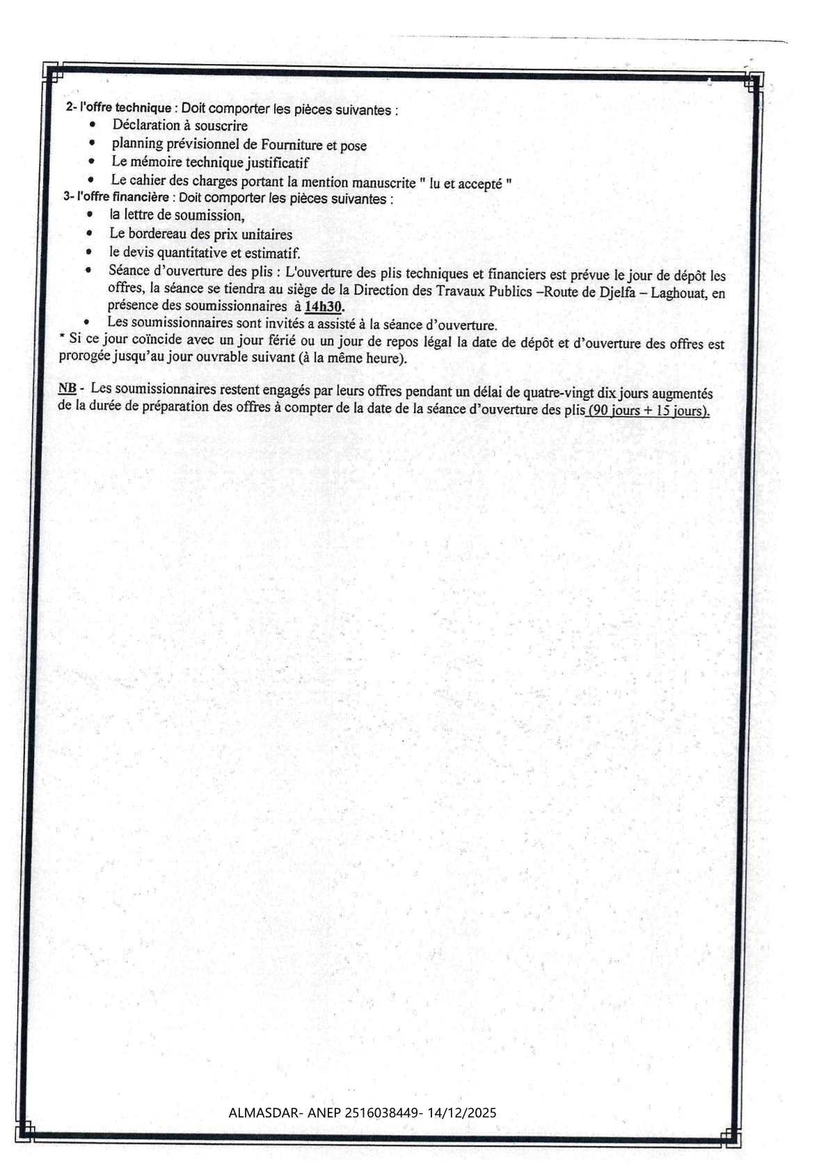 الزبون: direction des travaux publics wilaya de laghouat رقم ANEP 2516038449 تاريخ النشر: 2025-12-14 عدد الصفحات: 1/2