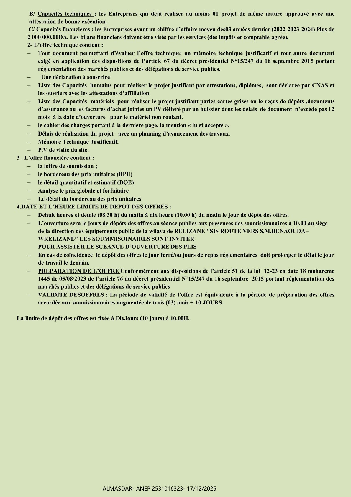 الزبون: Wilaya de RELIZANE DIRECTION DES EQUIPEMENTS PUBLICS رقم ANEP 2531016323 تاريخ النشر: 2025-12-17 عدد الصفحات: 1/2