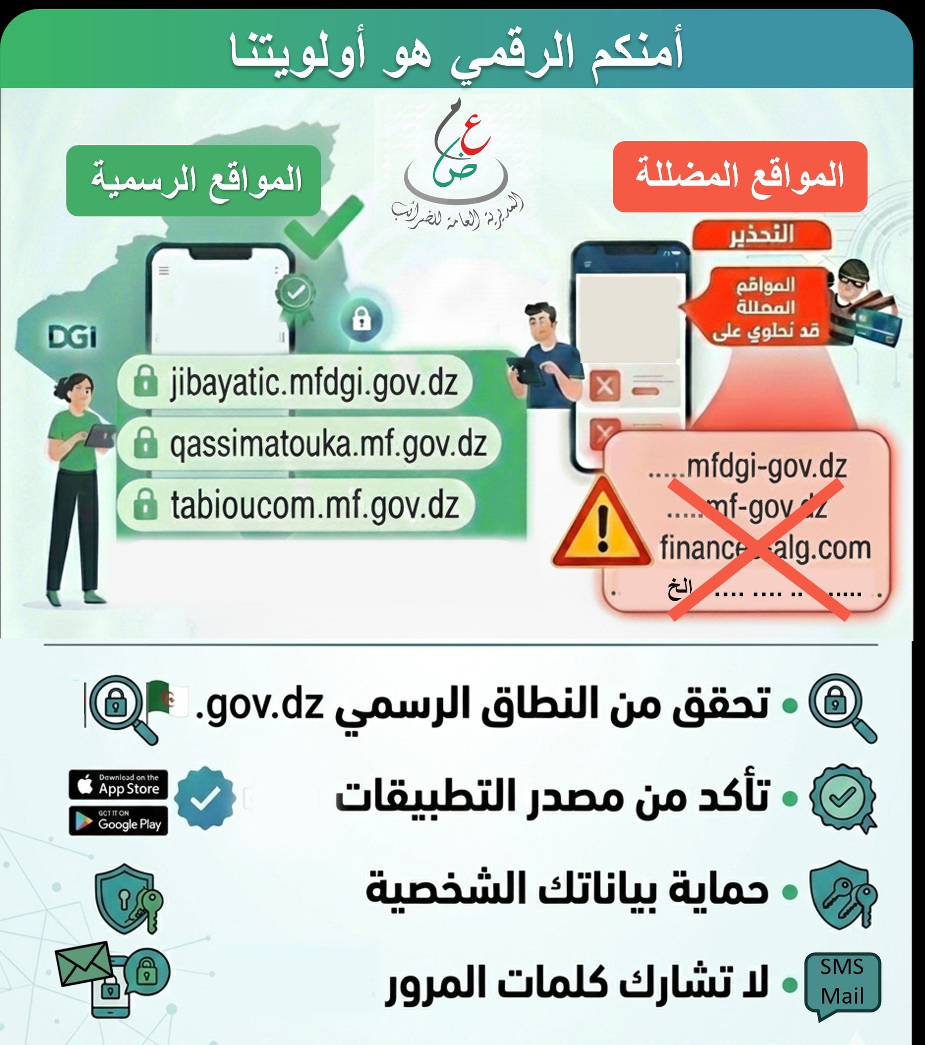 وحددت المديرية مجموعة من القواعد الأساسية للأمن الرقمي، منها: فحص الرابط والتأكد من امتداده بـ .gov.dz، وعدم تحميل أي تطبيق إلا من الروابط الرسمية، والحذر من المواقع التي تنتهي بـ (.com, .net, .org) لأنها غير رسمية.