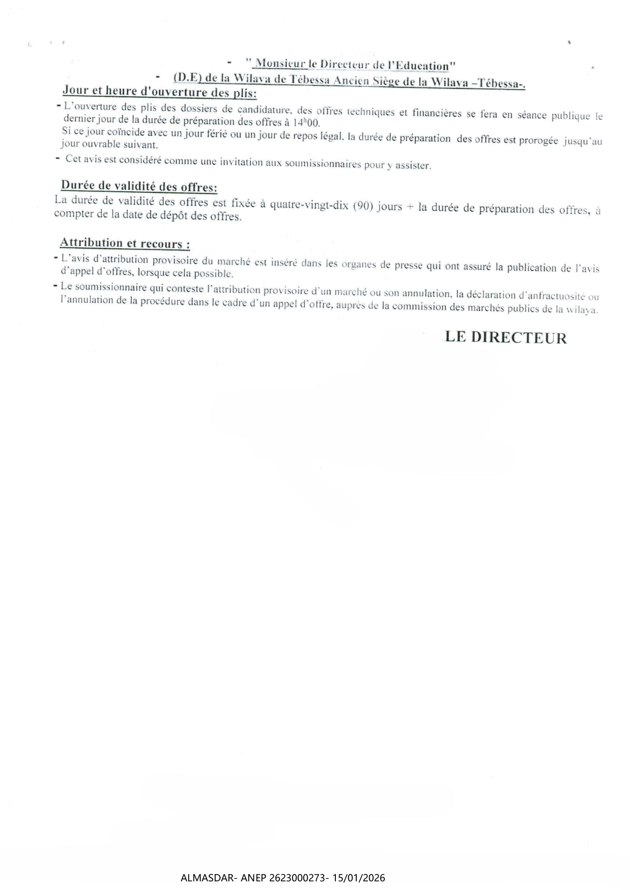الزبون: DIRECTION DE L'EDUCATION WILAYA DE TEBESSA رقم ANEP 2623000273 تاريخ النشر: 2026-01-15 عدد الصفحات: 3/4