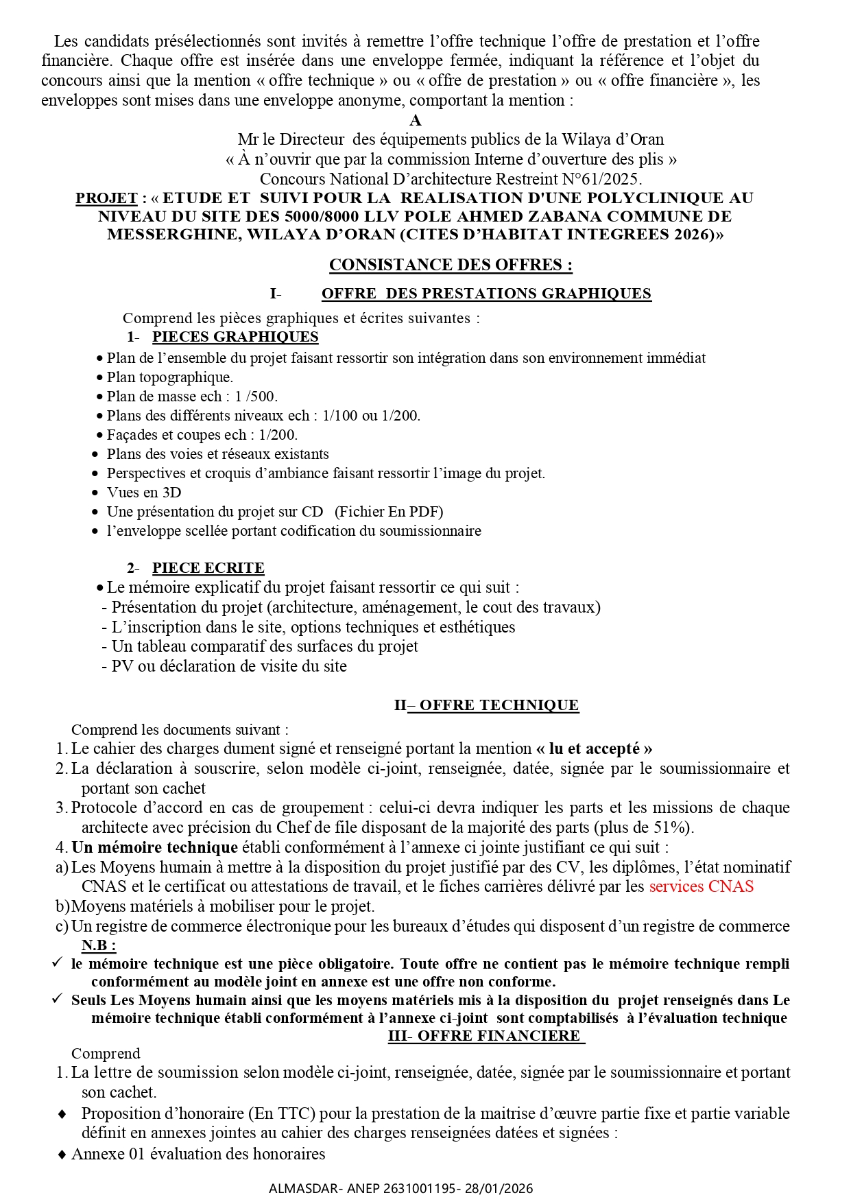 الزبون: DIRECTION DES EQUIPEMENTS PUBLICS DE LA WILAYA D’ORAN رقم ANEP 2631001195 تاريخ النشر: 2026-01-28 عدد الصفحات: 3/4