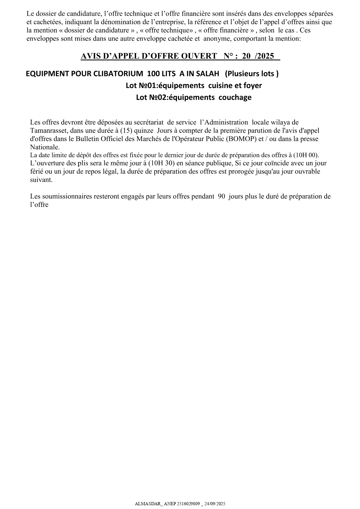 الزبون: DIRECTION DE L'ADMINISTRATION LOCALE DE LA WILAYA DE TAMANRASSET رقم ANEP 2516029809 تاريخ النشر: 2025-09-24 عدد الصفحات: 1/2